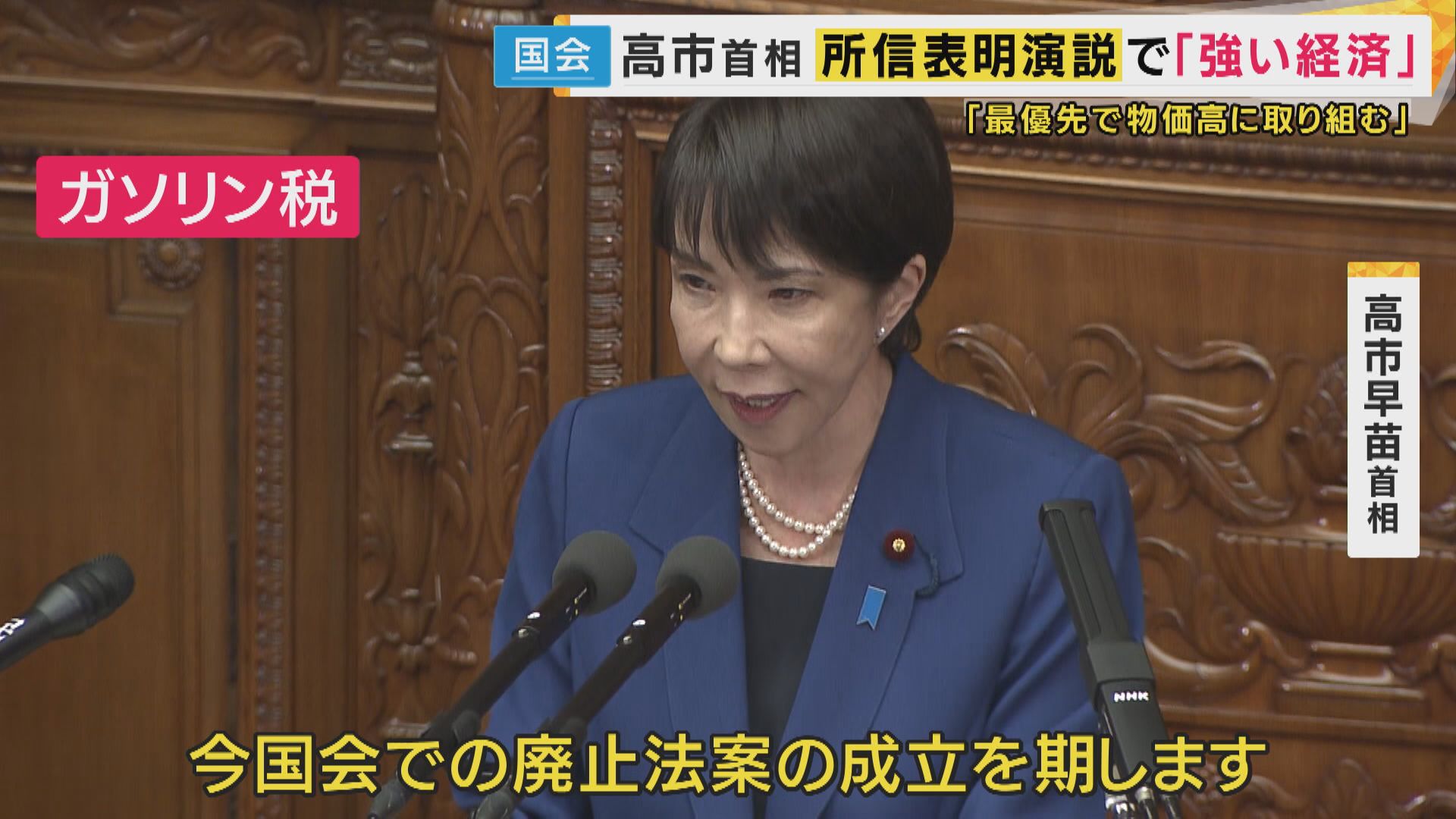 【高市早苗総理】「ガソリン税の暫定税率については各党間の議論を踏まえ、今国会での廃止法案の成立を期します」