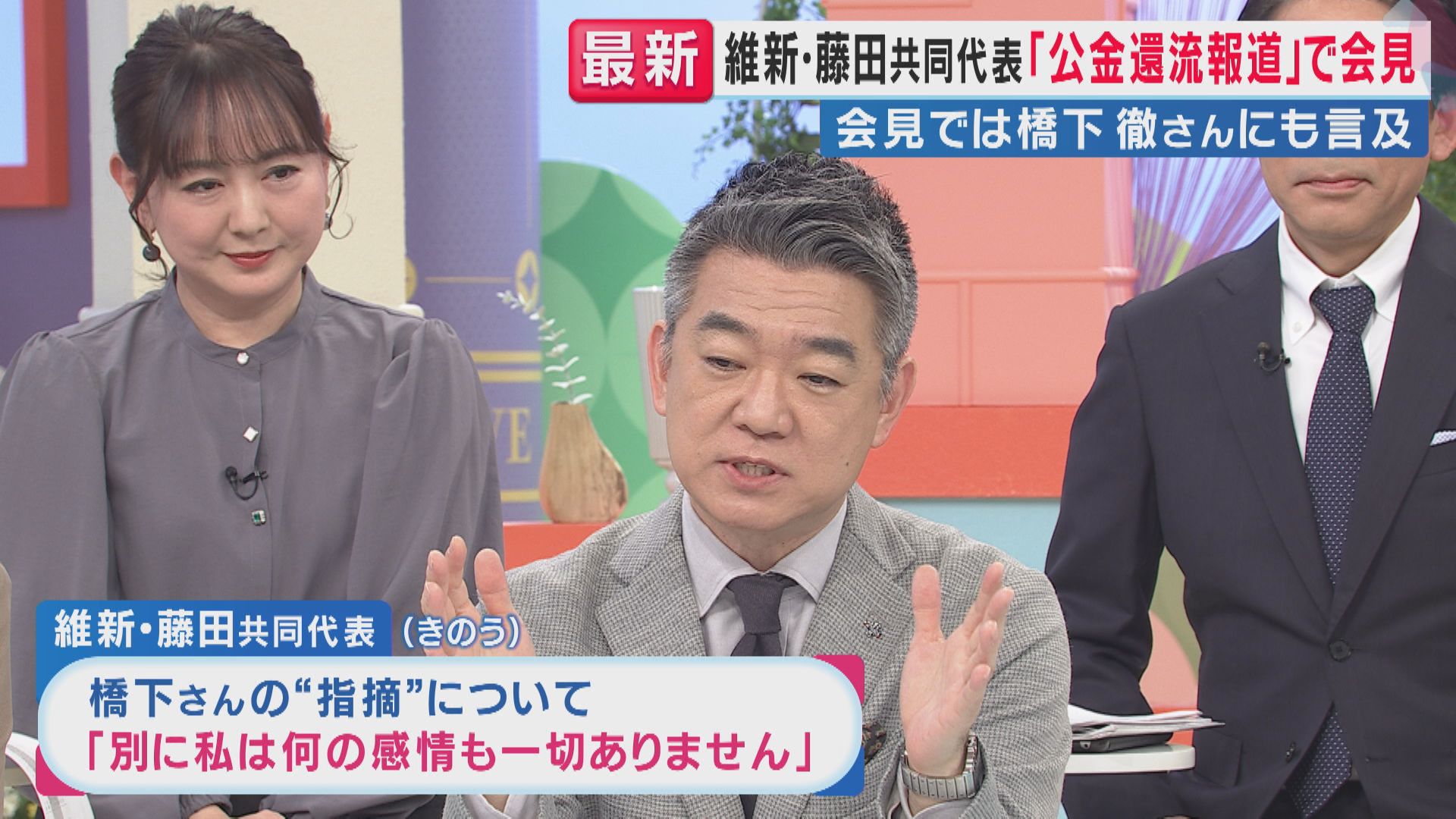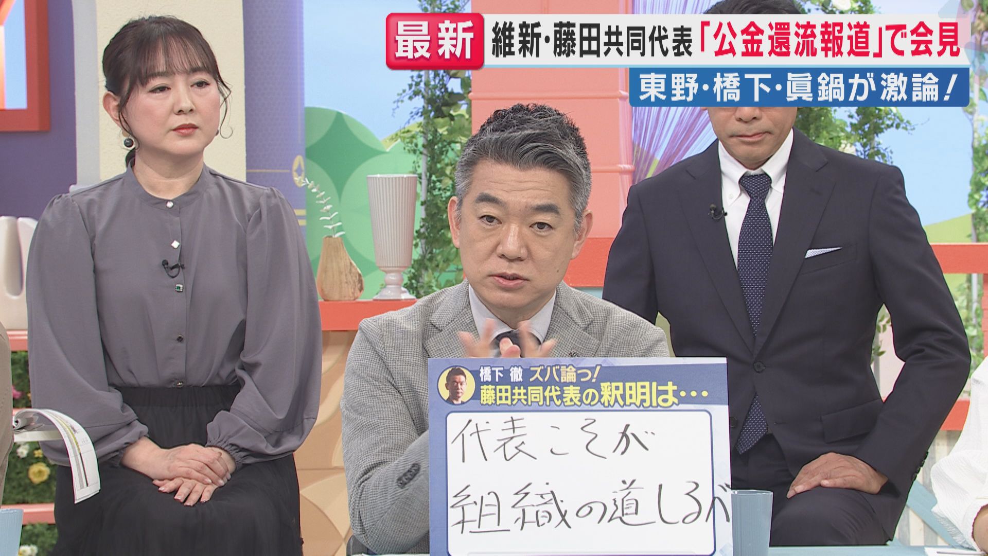この問題について、“維新の創設者”である橋下徹さんが「関西テレビ・旬感LIVEとれたてっ!」で、報道や藤田共同代表の会見での対応を巡って「代表こそが組織の道しるべ」と題し、「国民に負担も伴うような改革をやっていくときに、こういうリーダーが率いる政党の言うことを聞きますか」と厳しく批判しました。