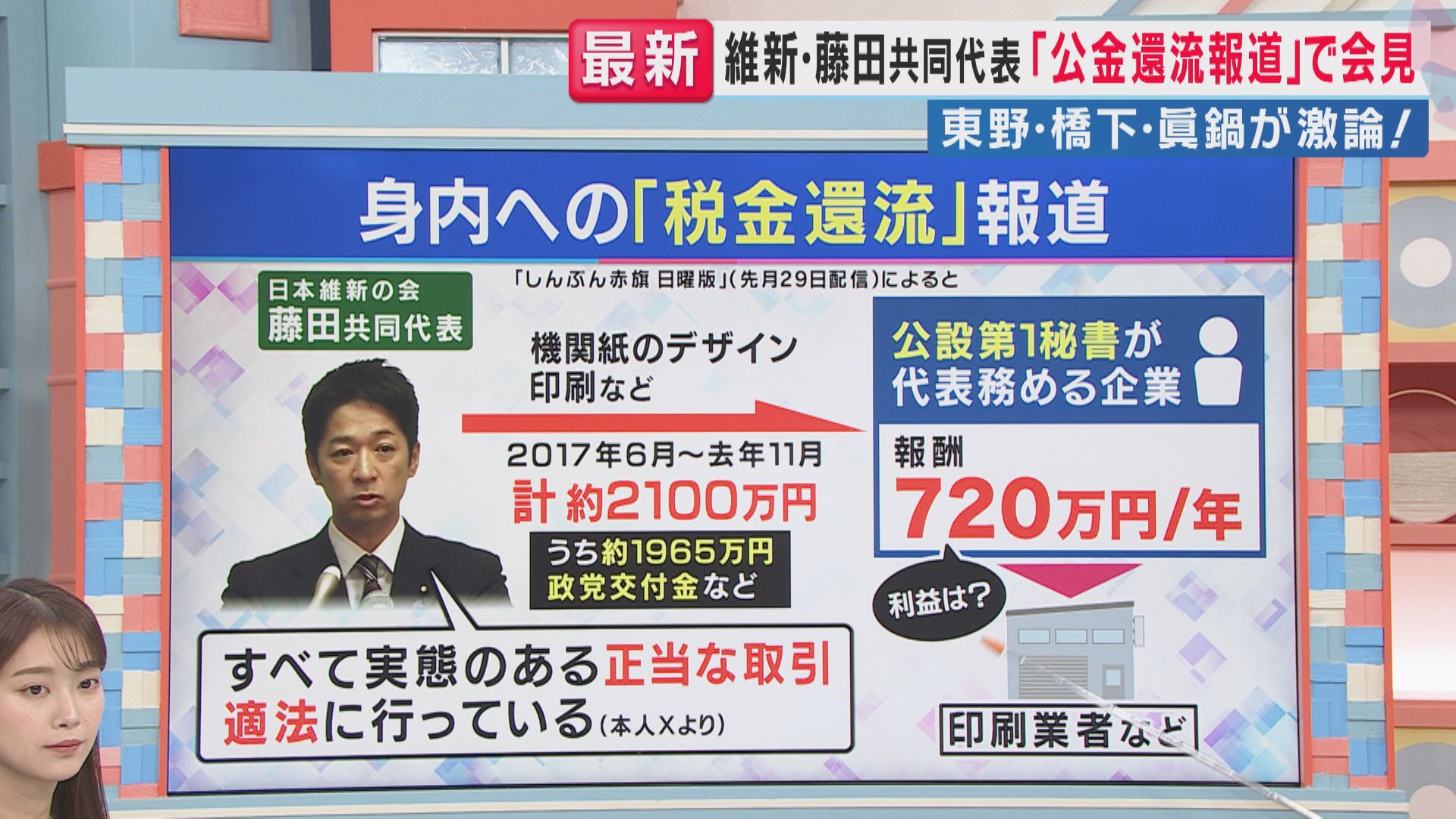 日本維新の会の藤田文武共同代表は4日、「秘書が代表の会社にビラや機関紙などを発注し、政党交付金などの公金から支払った」、「身内への公金還流」と報じられたことについて、記者会見で釈明しました。
