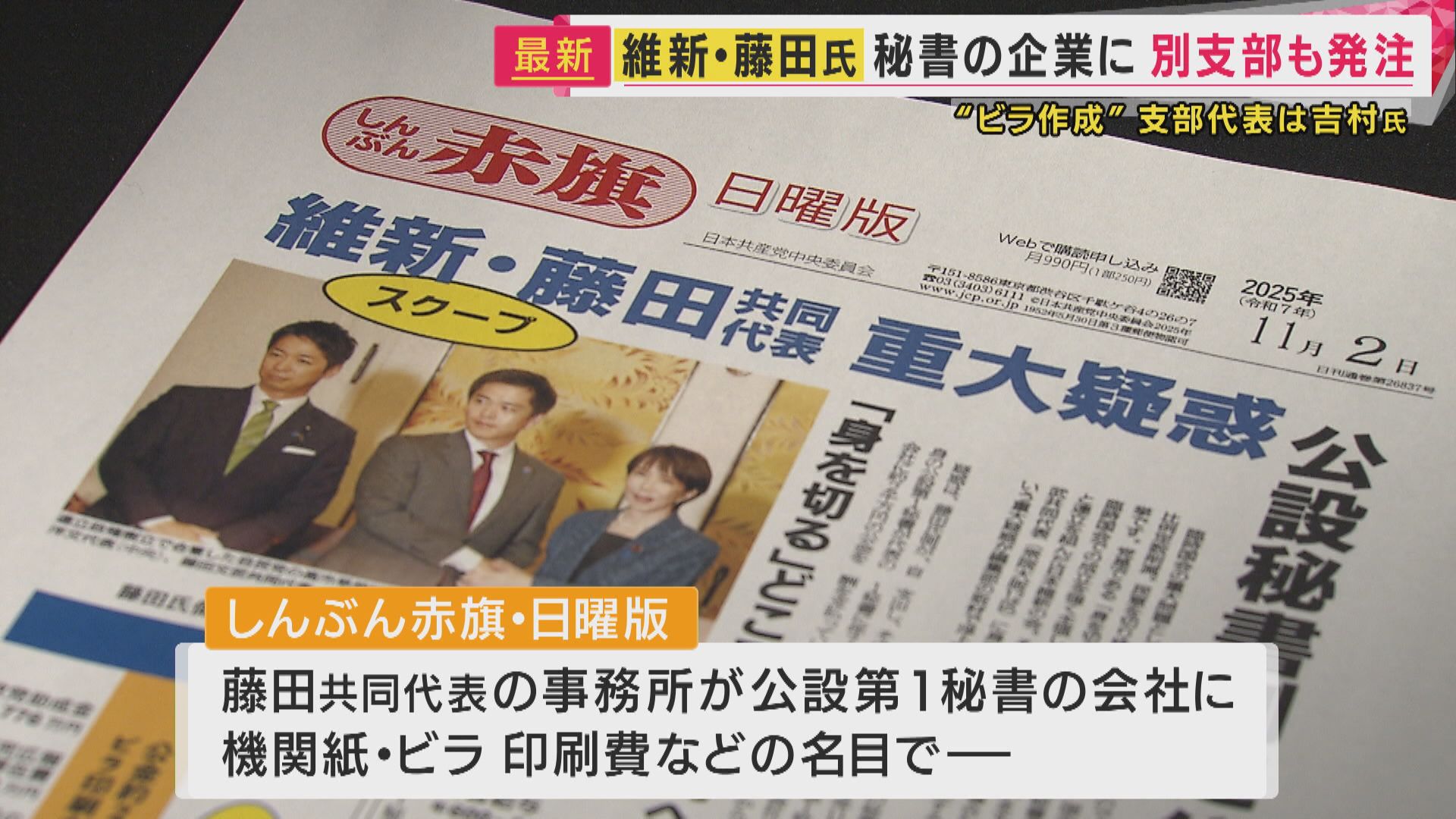 これに対し藤田共同代表は、「法的に問題がない。2100万円は大部分が機関紙のデザイン費。印刷実費などの仕入れ原価が当然に発生するものだ」と説明していました。