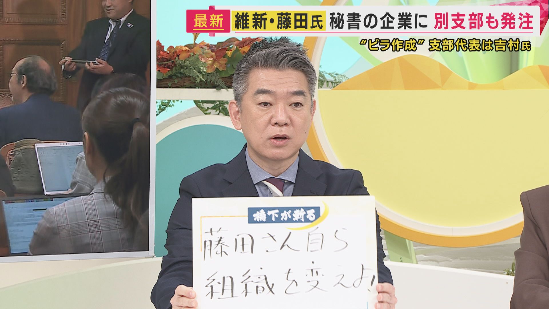 “維新の創設者”である橋下徹さんは『藤田さん自ら組織を変えよ』と題し、会見での対応も含めて藤田共同代表を厳しく批判する一方で、「ここで心を変えて、組織を変えてもらいたい」と話しました。
