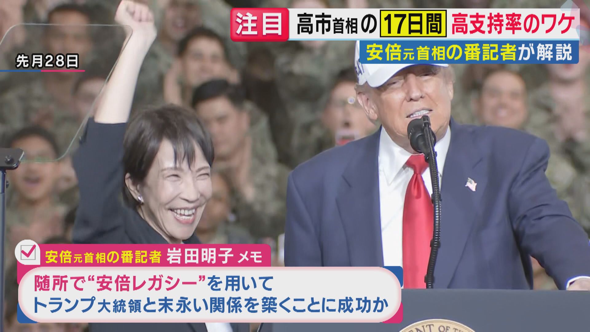 岩田さんは「トランプさんの安倍さんへの親密さを踏まえて、高市さんから安倍さんが使っていたパターをプレゼントしたり、安倍さんが話していた言葉を引用したり、(アメリカ大統領専用ヘリ)マリーンワンに一緒に乗ったりしていた」と解説。