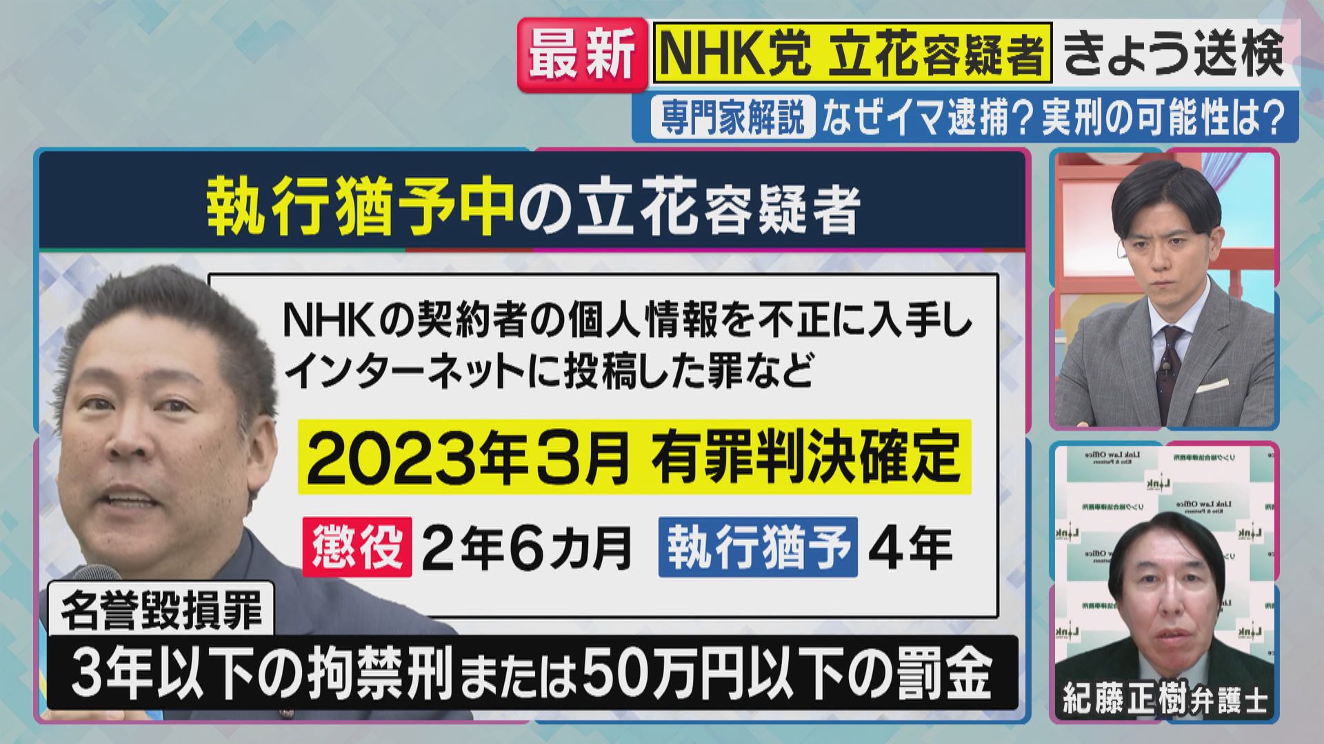 逮捕された立花容疑者は、NHKの契約者の個人情報を不正に入手し、インターネットに投稿したなどとして、2023年3月、懲役2年6カ月、執行猶予4年の有罪判決が確定をしています。