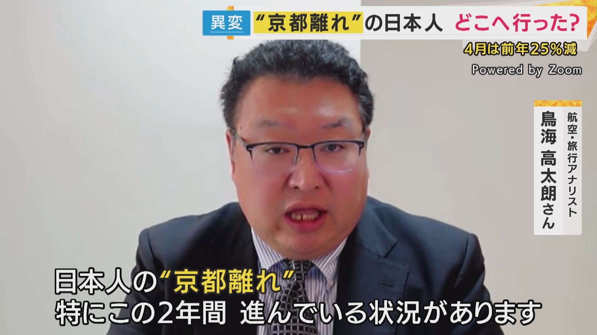 航空・旅行アナリストの鳥海高太朗さんは、「日本人の”京都離れ”が特にこの2年間、進んでいる状況があります。バスに簡単に乗ることができない、満席で乗車ができなかったり。日本人は”静かでゆったり見たい”という環境(を好む)の中で、今それができていない」と分析します。