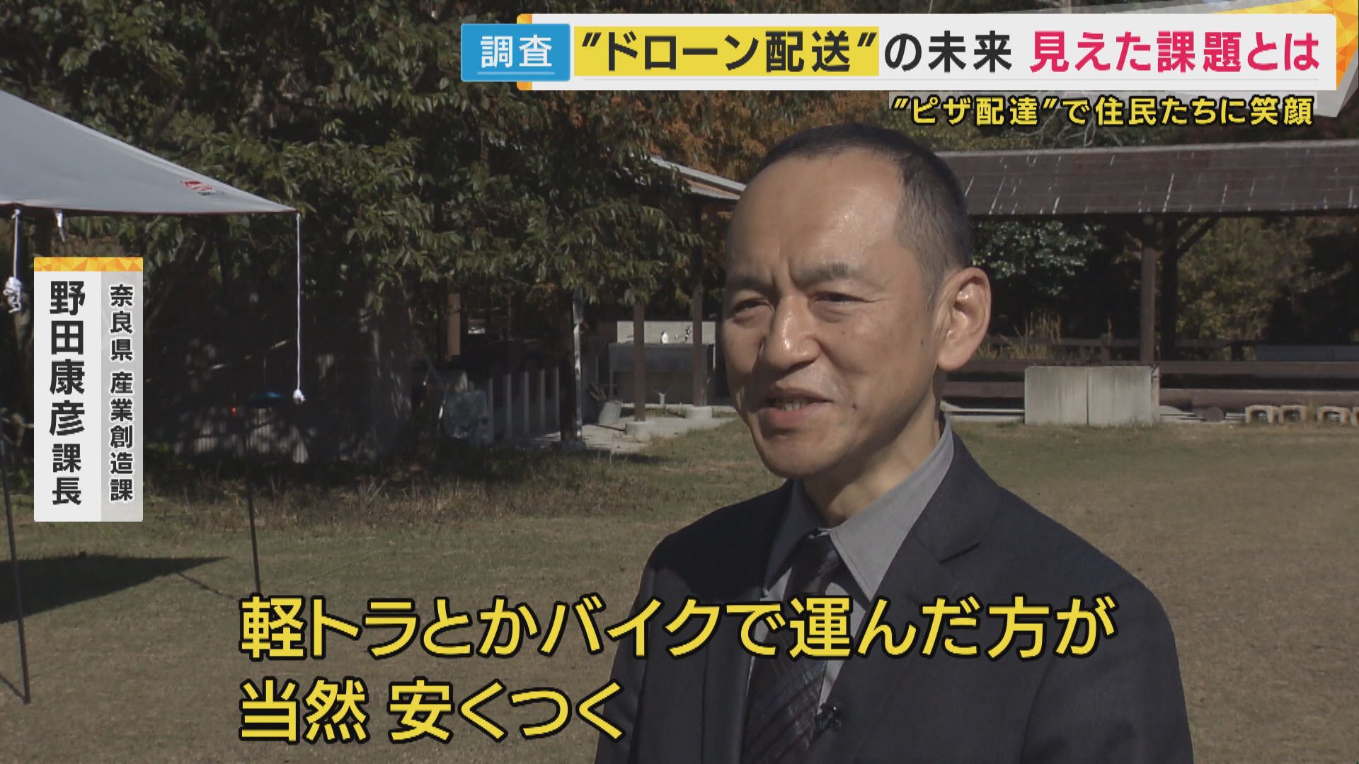 【奈良県産業創造課 野田康彦課長】「操縦をする人、場所によったら監視する人を下に置かなければならない。人的なコストがかかります。今はもう、ぶっちゃけ言いますと、軽トラとかバイクで運んだ方が当然、安くつく」