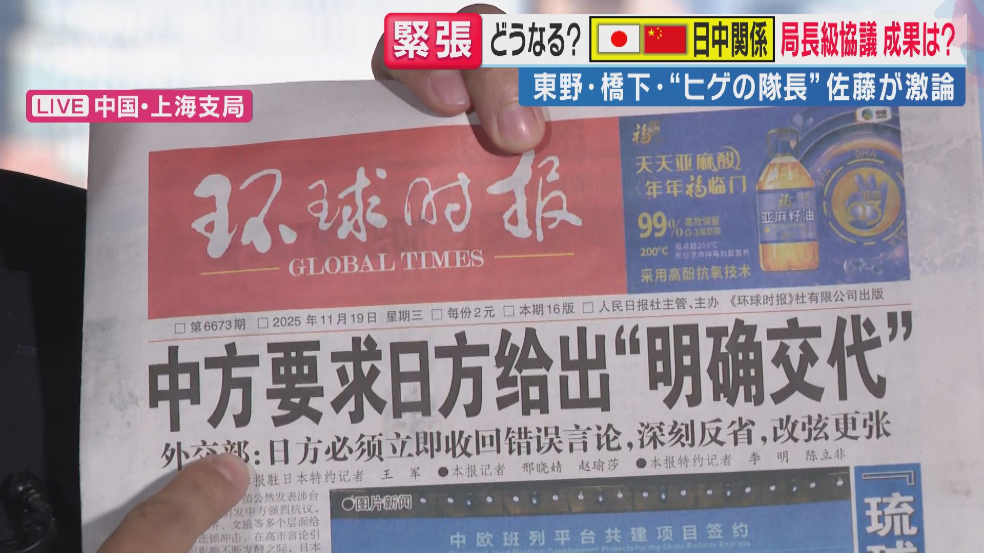 【上海支局 工藤雄矢特派員】「中国共産党系の新聞『環球時報』では、『中国が日本側に明確な説明を求める。日本は誤った発言を直ちに撤回し、深く反省し、政策方針を改めるべきだ』といった見出しで取り上げています。