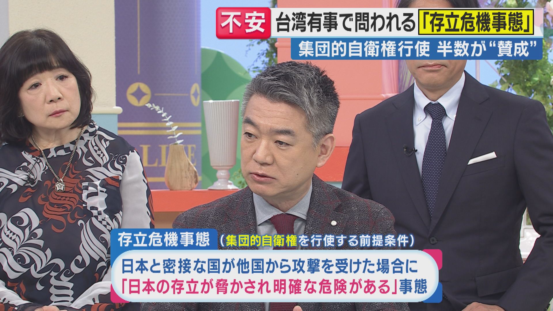 「存立危機事態については、あれは“米軍がもし攻撃を受けた時”には、日本は助けに行く。米軍のために我々は動くということは、日米安全保障条約もあるし、国際社会、誰も否定できない。だから今回の存立危機事態の発言を、撤回・修正・取り消しまでは言わなくてもいいけれども、あくまでも米軍の話なんだということを、国民全体でそういう意識を持つことが重要」と指摘しました。