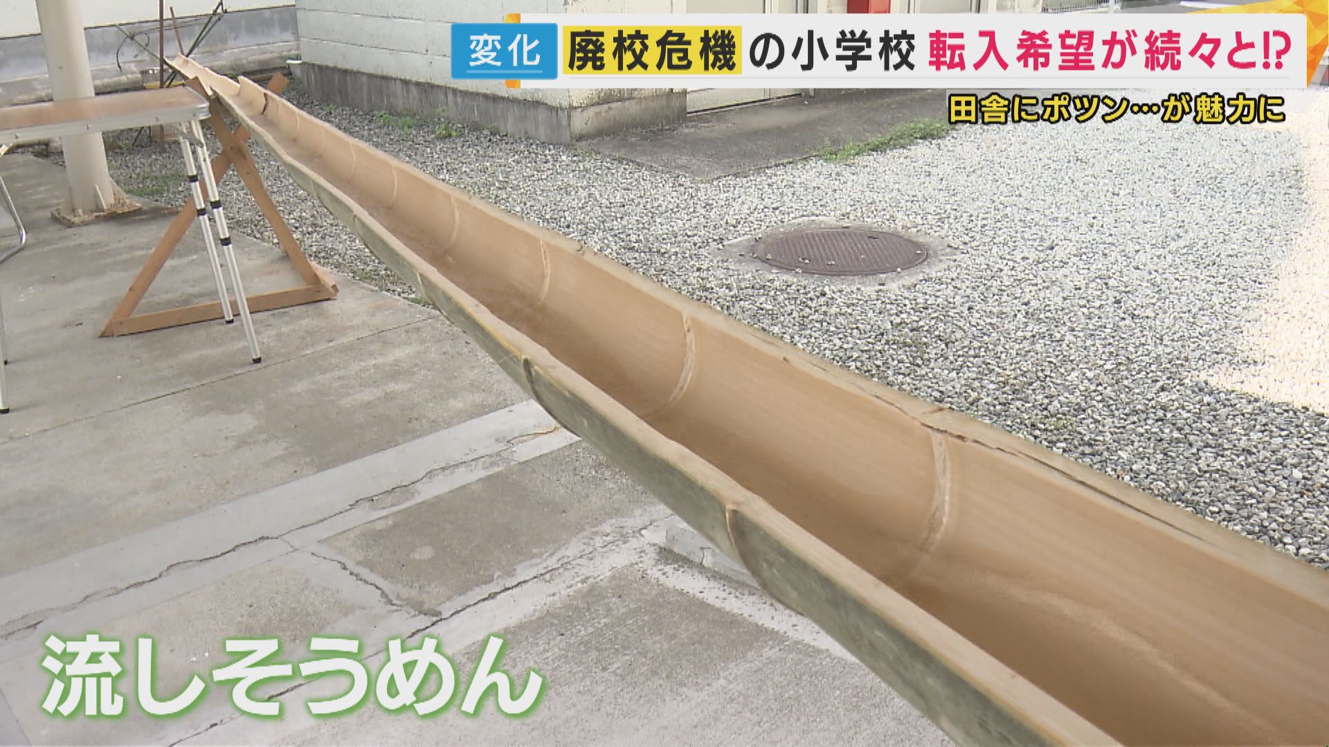 放課後、体育館の前に流しそうめんの竹が用意されていました。