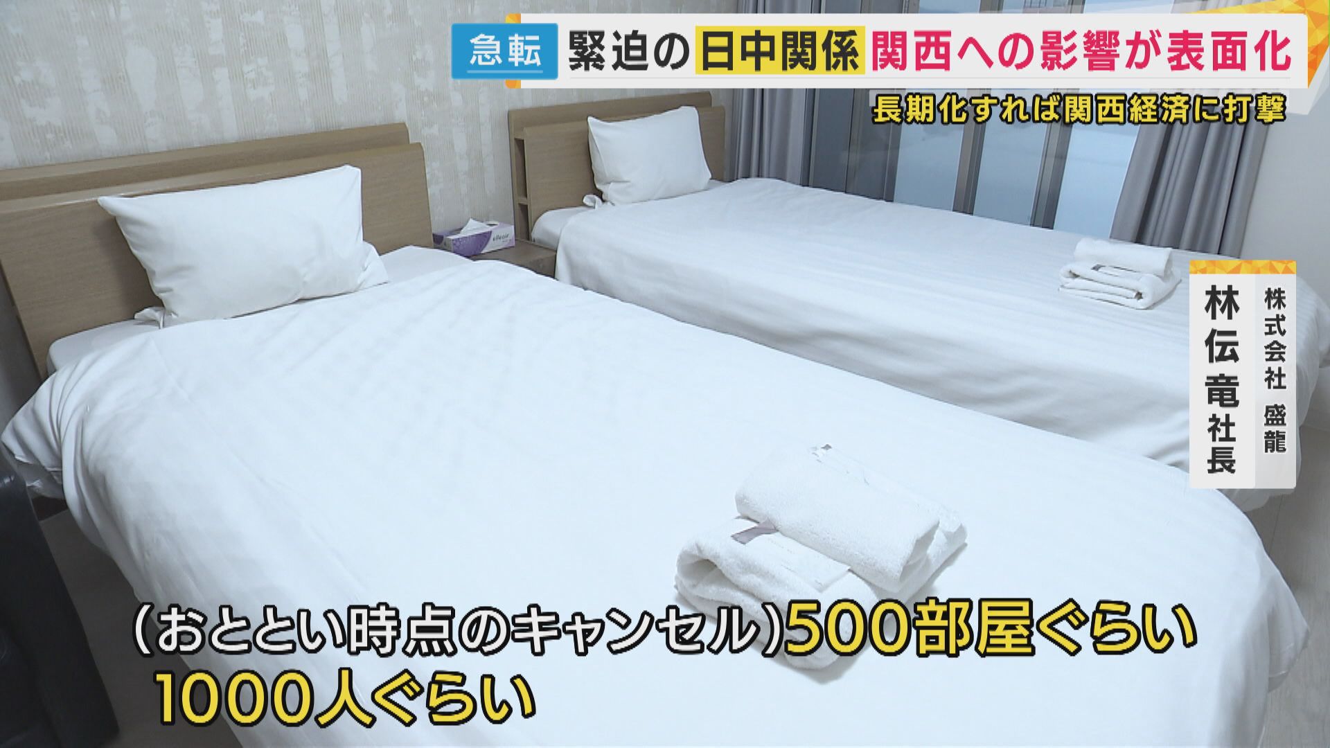 【林伝竜社長】「先週から、困ってる。キャンセルけっこう出てきてる。(18日時点で)500部屋くらい。1000人くらいは(キャンセル)。キャンセル1000人なったら1000万円くらい収益少なくなる」