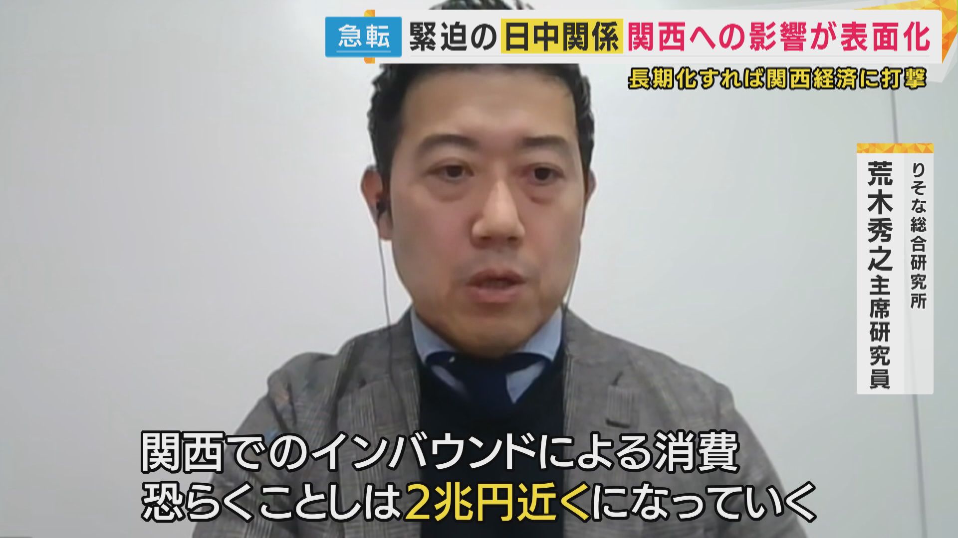 【りそな総合研究所・荒木秀之主席研究員】「関西でのインバウンドによる消費、おそらく今年は2兆円近くになっていくと思うんですけれども、そのうちの35%前後、これを中国人の方が占めるようなイメージ。