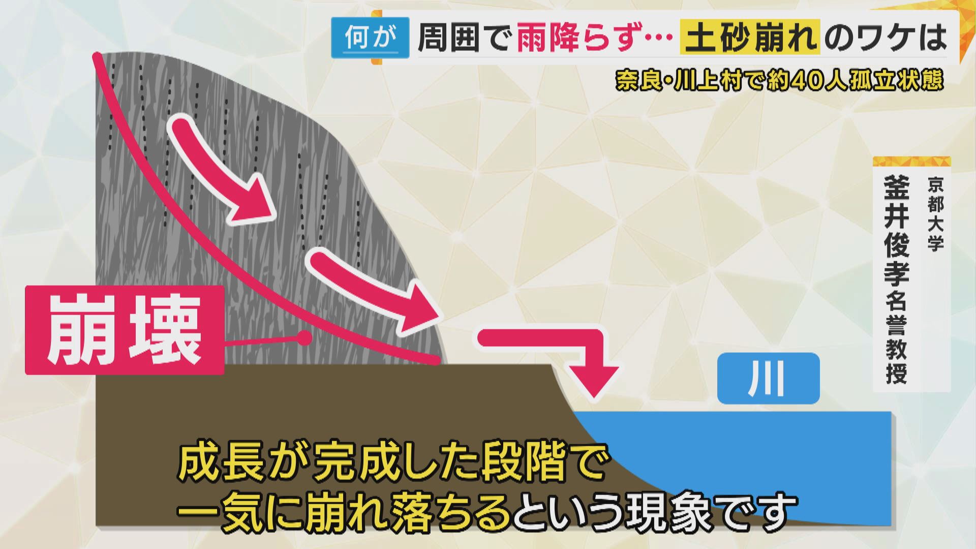 【京都大学・釜井俊孝名誉教授】「この地域は岩盤が非常に浅いところだから、岩盤に小さな割れ目がいっぱいあるわけです。 破壊した面が一気にできるのではなくて、徐々に成長していくわけだから、成長した段階で一気に崩れ落ちるという現象です。 (斜面の)上からポロポロと岩が崩れてくることがあるので、そういった現象が見られたら、その斜面は危ない」