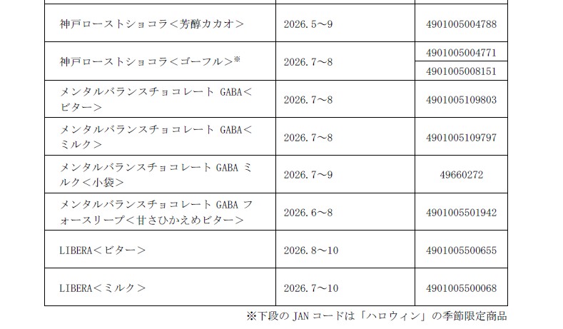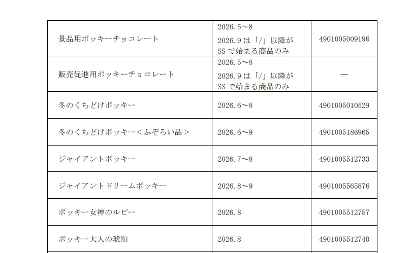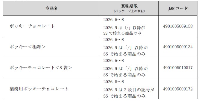 主な対象商品は「ポッキーチョコレート」「ポッキー<極細>」「冬のくちどけポッキー」「ジャイアントポッキー」「神戸ローストショコラ」「メンタルバランスチョコレートGABA」「LIBERA」など20品目です。