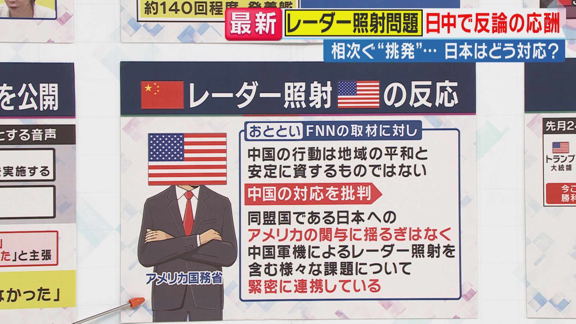 アメリカ国務省報道官は「中国の行動は地域の平和と安定に資するものではない」と中国の対応を批判。「同盟国である日本へのアメリカの関与に揺るぎはなく、中国軍機によるレーダー照射を含む様々な課題について緊密に連携している」と述べています。