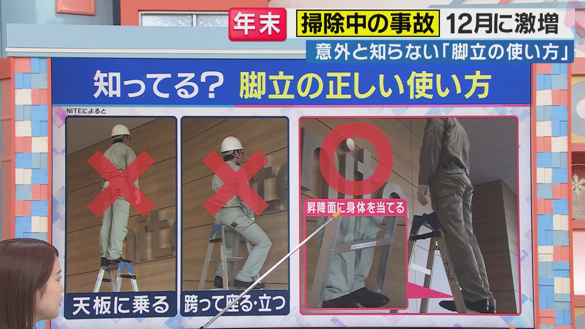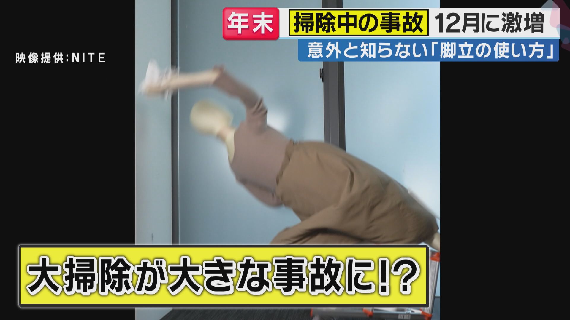 製品評価技術基盤機構(NITE)は、踏み台などを使用する時に身を乗り出したり、つま先立ちをしたりするとバランスを崩して転倒・転落の恐れがあるとして、踏み台を移動させてから掃除するよう呼びかけています。