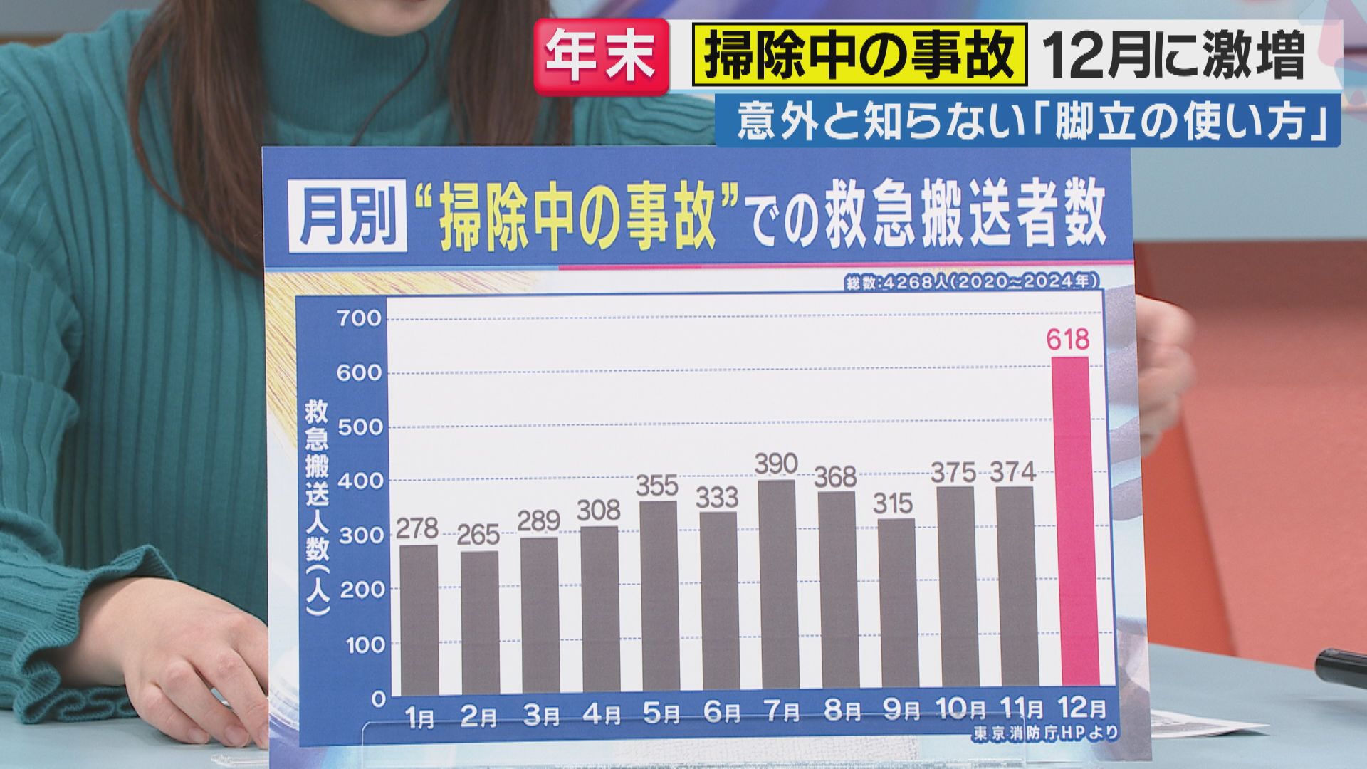 東京消防庁の統計によると、月別の掃除中の事故救急搬送数(2020年~2024年)は総数4,268人にのぼり、12月が618人と最も多くなっています。