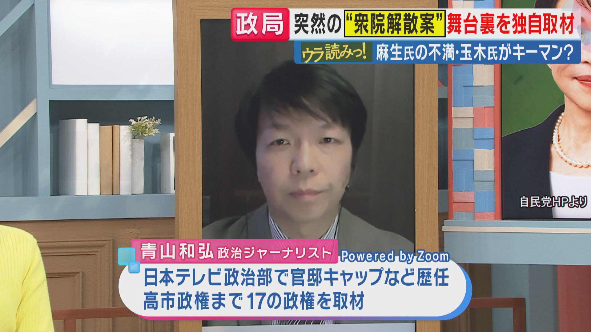 今回「解散案」を知らされていなかったという、麻生副総裁は元々「解散は来年でいい」という主張だったと青山さんは明かします。