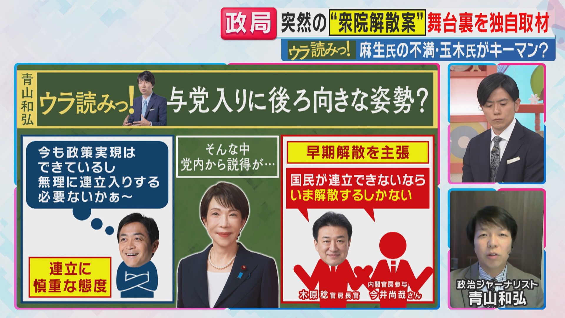 【青山和弘さん】「まず自民党内の情勢調査で単独過半数を取れそうだという数字が出た。国民民主党が入ってしまうと、実は解散がやりにくくなる。