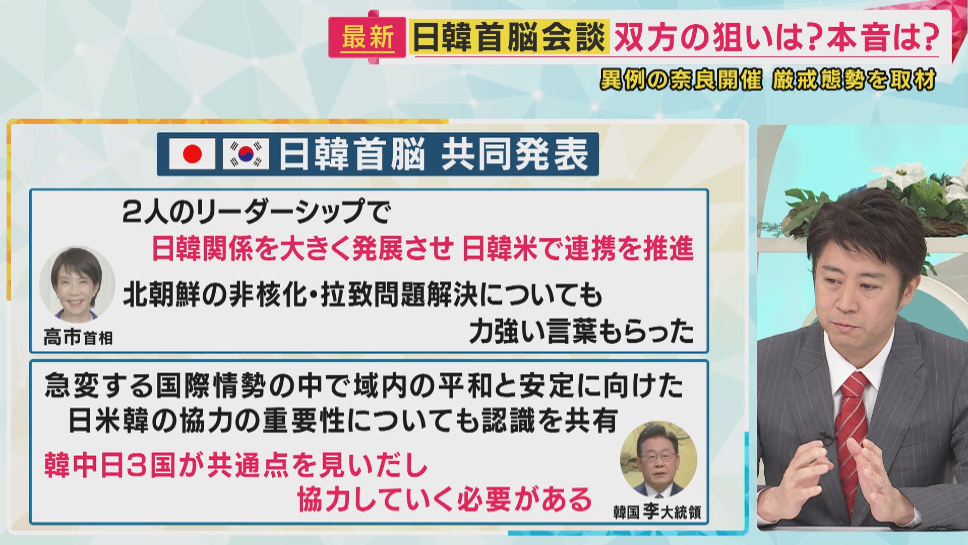 会談冒頭、高市総理は「本年のシャトル外交の最初の機会に私のふるさとここ奈良にお迎えすることができて、皆様を歓迎したいと思います」と述べ、「大統領と共に日韓関係を前に進めながら両国が地域の安定に連携して役割を果たしていくべきという考えを新たにしました」と語りました。