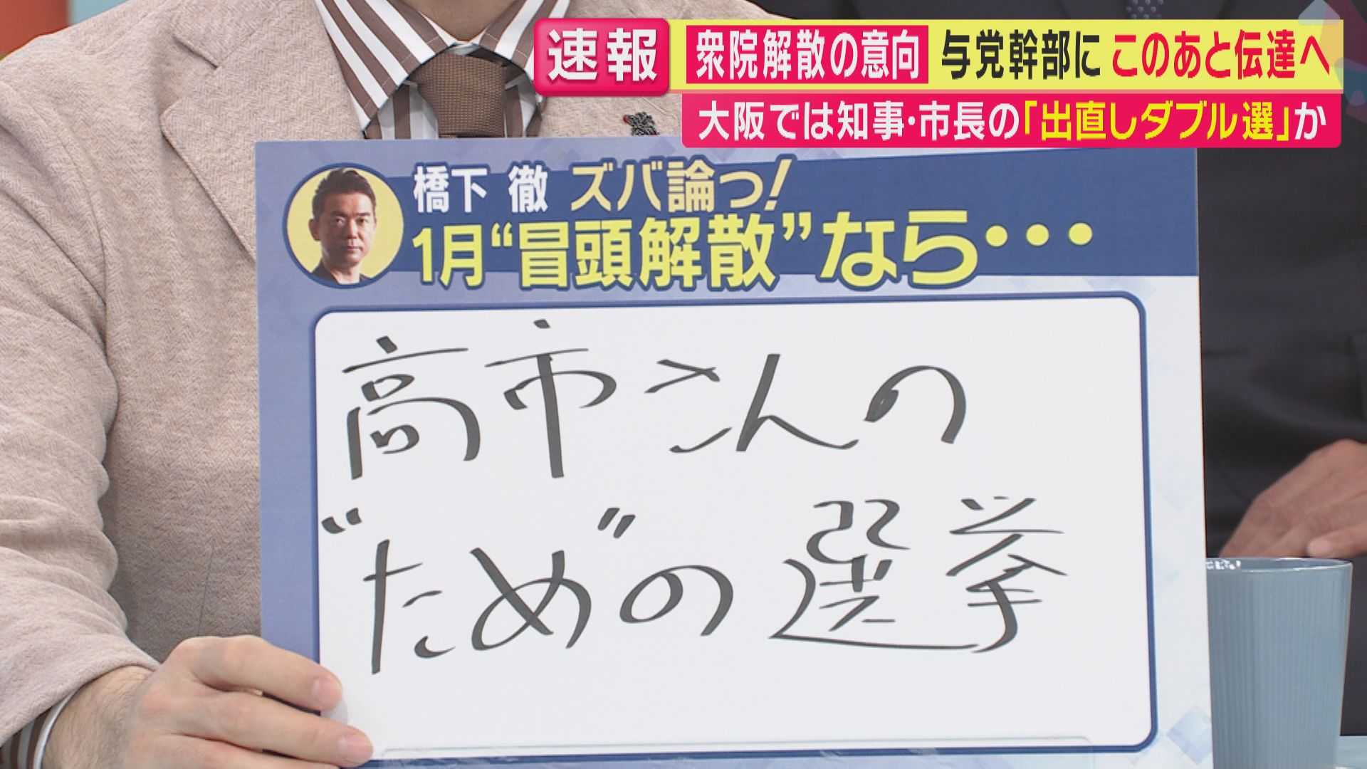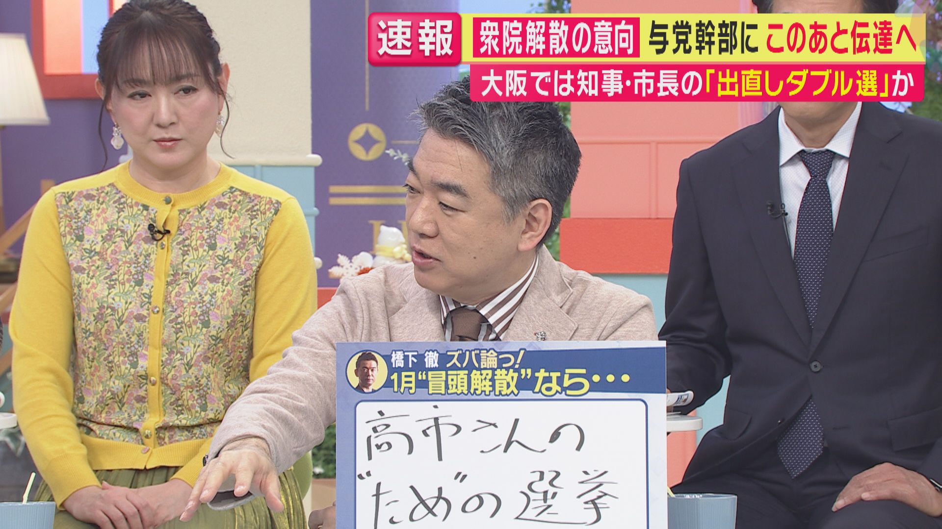 高市早苗首相が通常国会冒頭で衆議院を解散する意向を与党幹部に伝えると報じられる中、「旬感LIVE とれたてっ!」元大阪府知事・市長の橋下徹さんは衆議院が解散された場合に実施される選挙を「高市さんの”ため”の選挙」と指摘しました。
