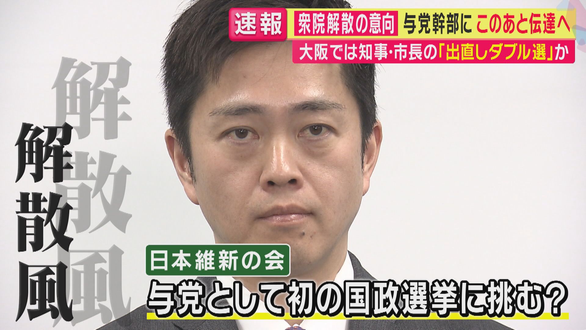 大阪府の吉村洋文知事が、都構想への3回目の住民投票を実施するための民意を問うため、大阪府知事・大阪市長のW選挙を実施する意向を固めたことについて、日本維新の会の設立者で元大阪府知事、元大阪市長の橋下徹氏は「都構想実現のためのW選挙実施は副首都法案が国会で通ったあとに行うことが維新内の規定路線だったが、吉村知事が政治状況の先行きが不透明なことから、このタイミングで実施することを決断した」との見方を示しました。