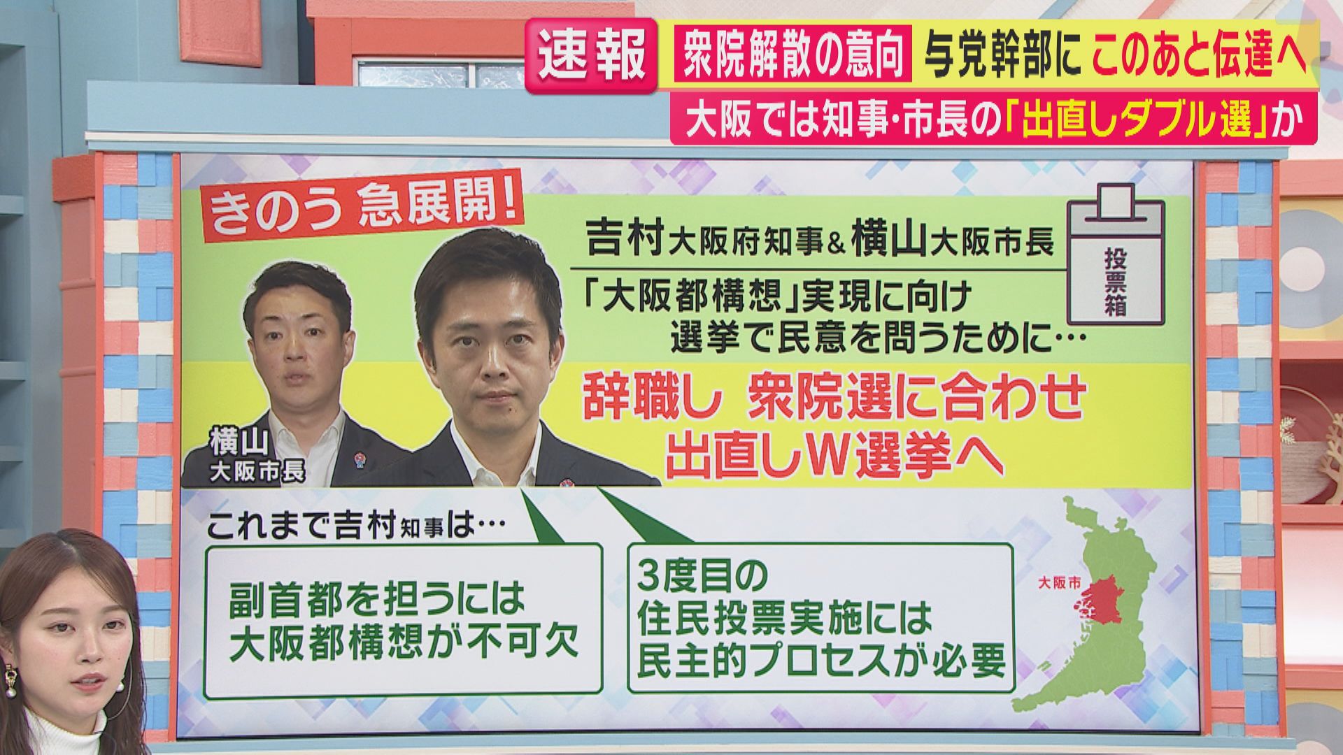 【橋下徹氏】「これは吉村さんのための選挙になります。というのは今、大阪府議会、大阪市議会は維新が過半数を持っていますから、W選挙をやらなくても大阪都構想の是非を大阪市民に問う住民投票まではもっていける。