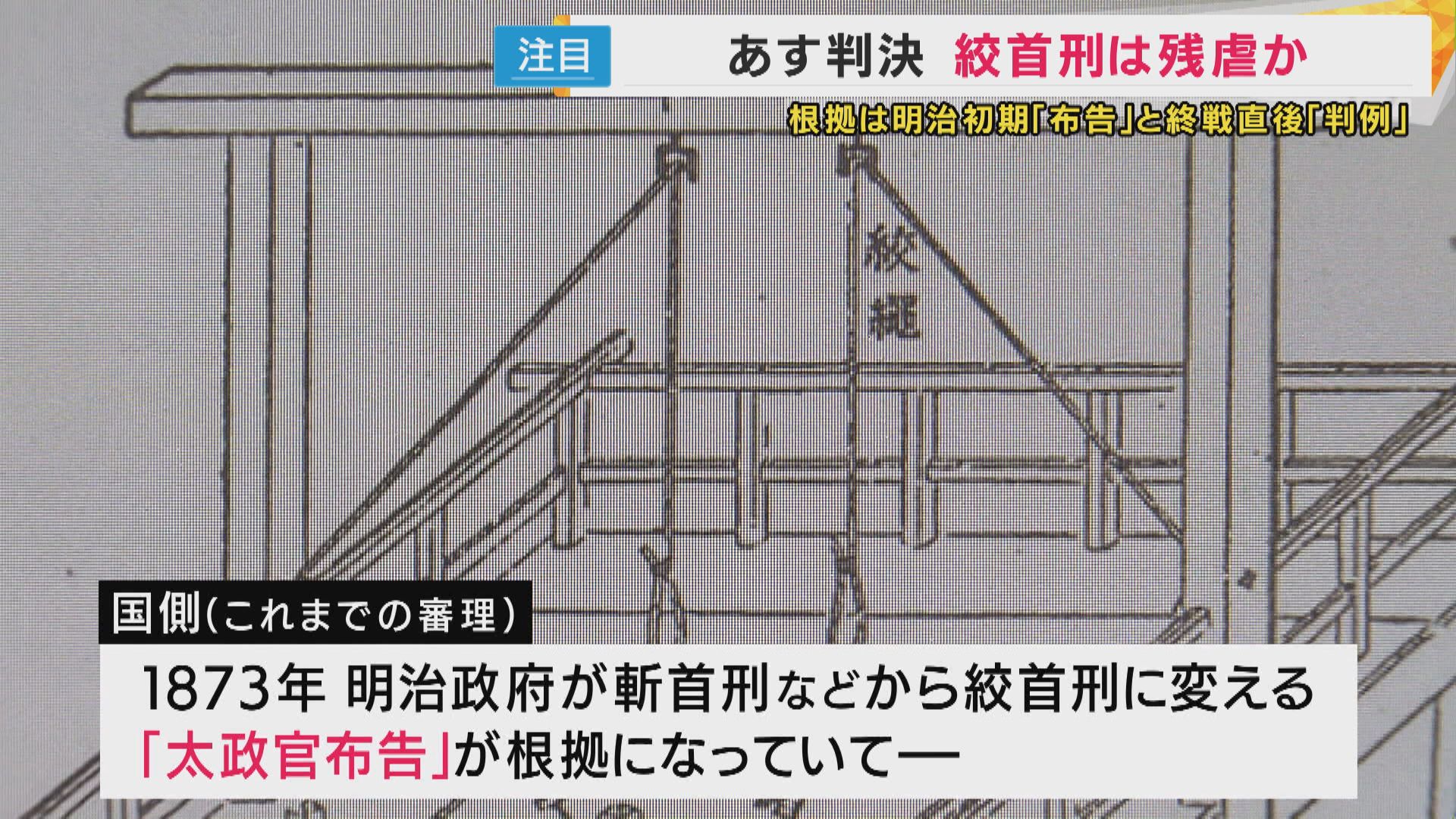 一方、国側はこれまでの審理で刑の執行は1873年に明治政府が斬首刑などから絞首刑に変える「太政官布告(だじょうかんふこく)」が根拠になっていて、基本構造は当時から変わっていないと主張。