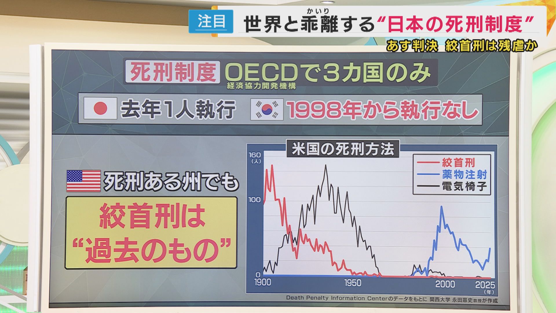 現在、死刑制度があるのは先進国を中心としたOECD加盟38カ国のうち、日本、韓国、アメリカの3カ国です。日本では去年1人に死刑が執行された一方で、韓国では1998年から死刑の執行はありません。