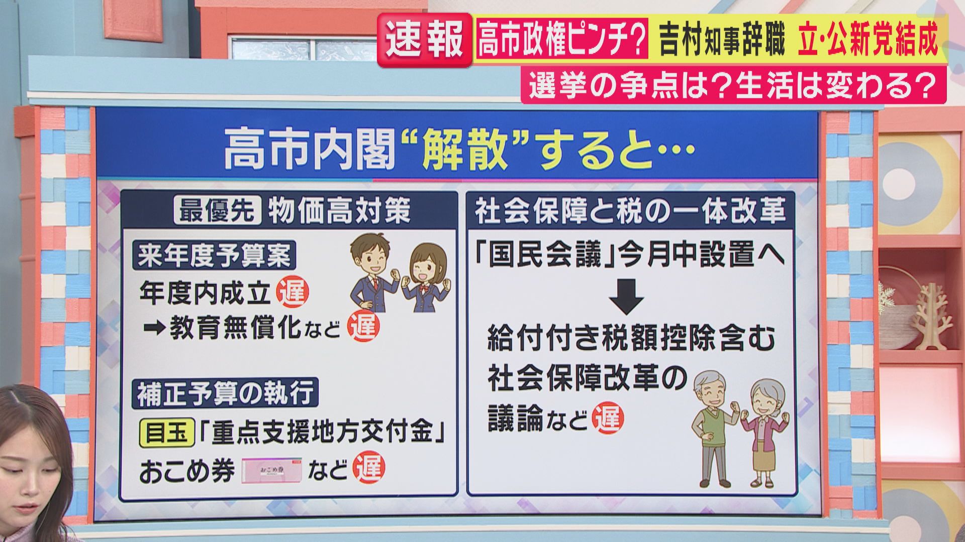 高市政権が掲げる教育無償化や社会保障と税の一体改革といった政策の実現が遅れる一方で、物価高に苦しむ国民の生活をどう支えていくのか。解散・総選挙を前に、各党の政策対決が注目されます。