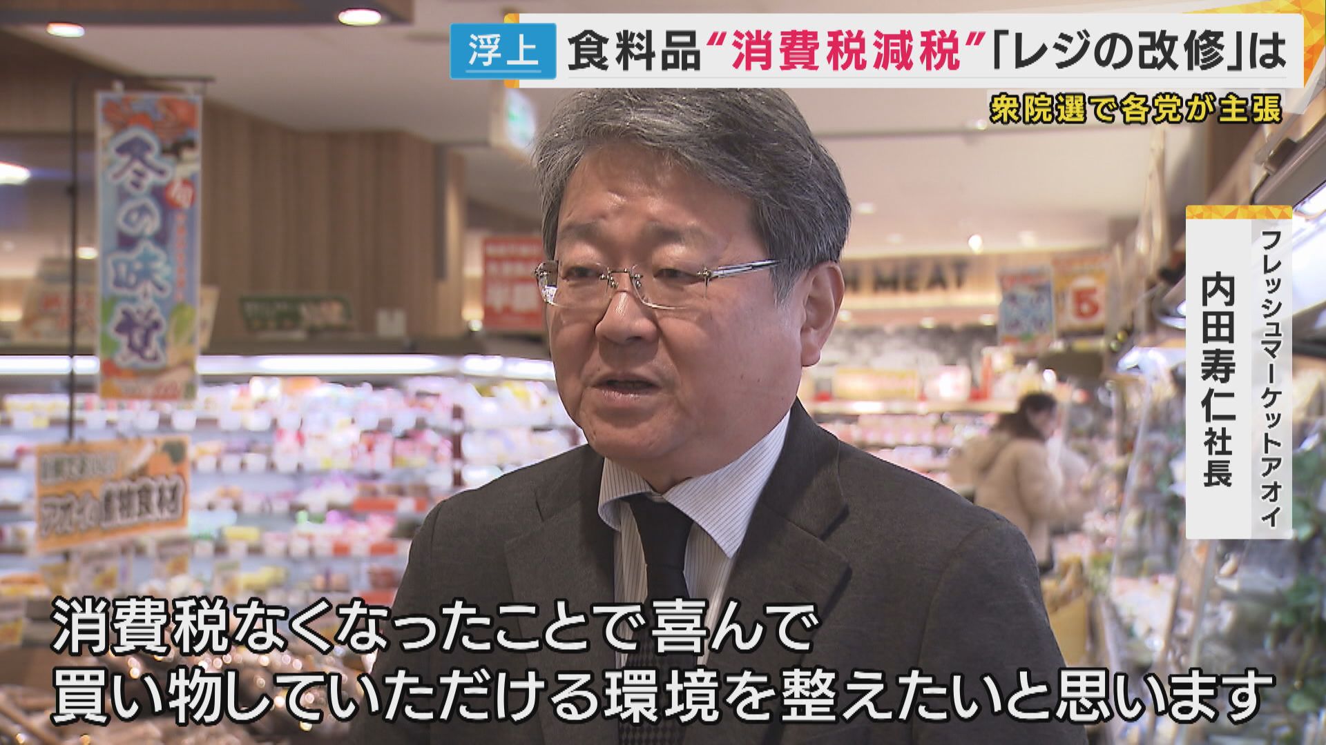 【フレッシュマーケットアオイ 内田寿仁社長】「おうちでごはん食べる機会が増えるのではないかなと思うので、私たちスーパーへのご来店も増えると思う。消費税なくなったことで喜んで買い物していただける環境を整えたいと思います」