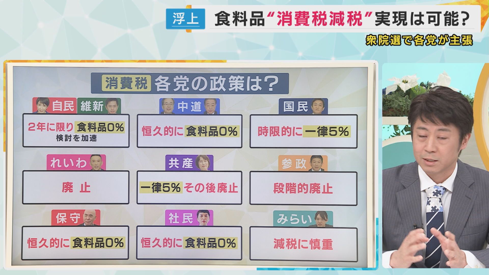 番組コメンテーターの亀井正貴弁護士は「各党、消費税を廃止するか、もしくはパーセンテージを下げるか、もしくは時限的に下げていくかという点では、一致しているが、各党の案がバラバラ。一致してるわけじゃない。自民と維新が圧倒的多数を取れば別ですけども、そうじゃない場合に、消費税の減税等は本当に実現するんだろうか。政局における単なる論点にしか過ぎないんじゃないか」との見方が示しました。