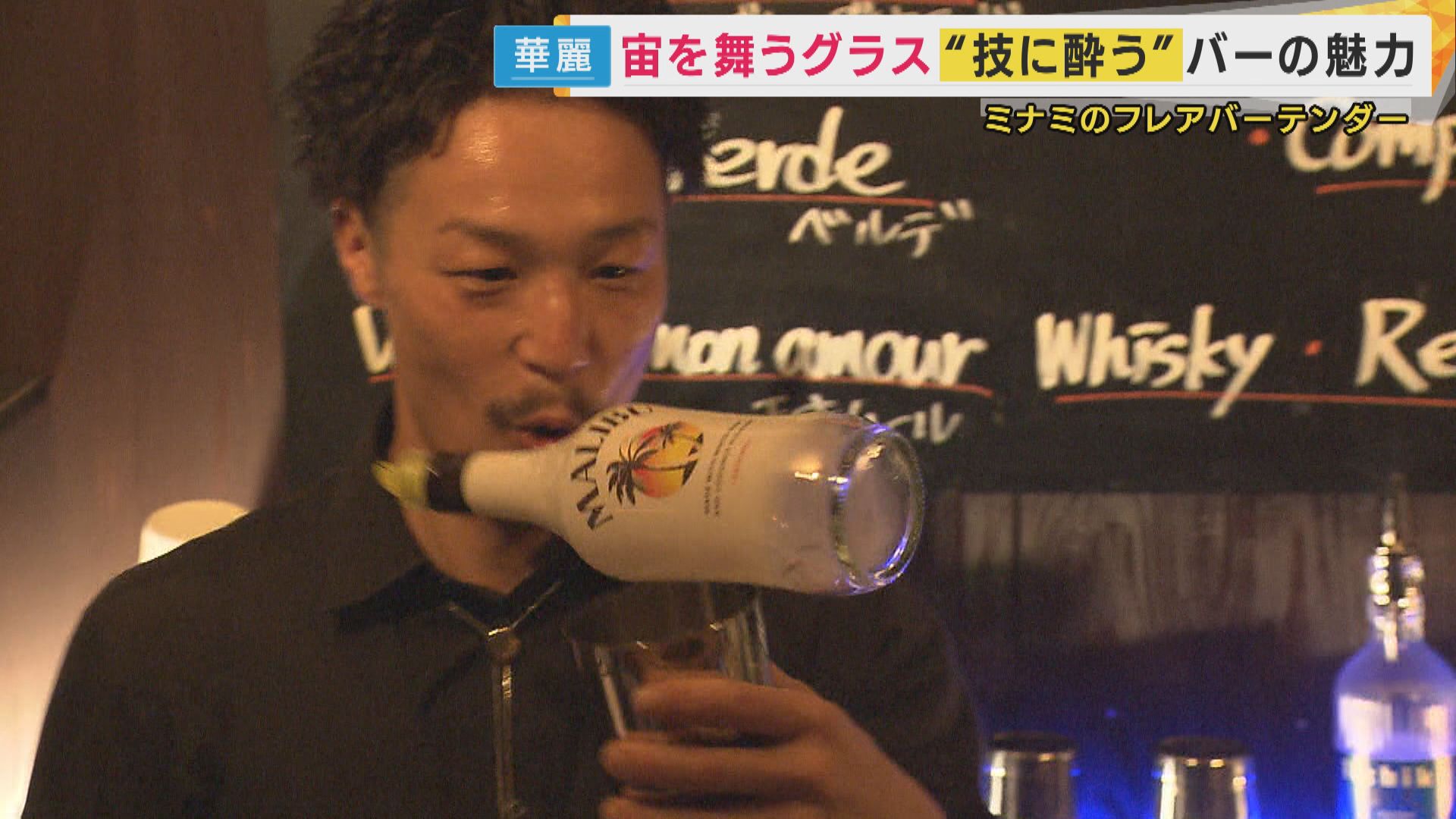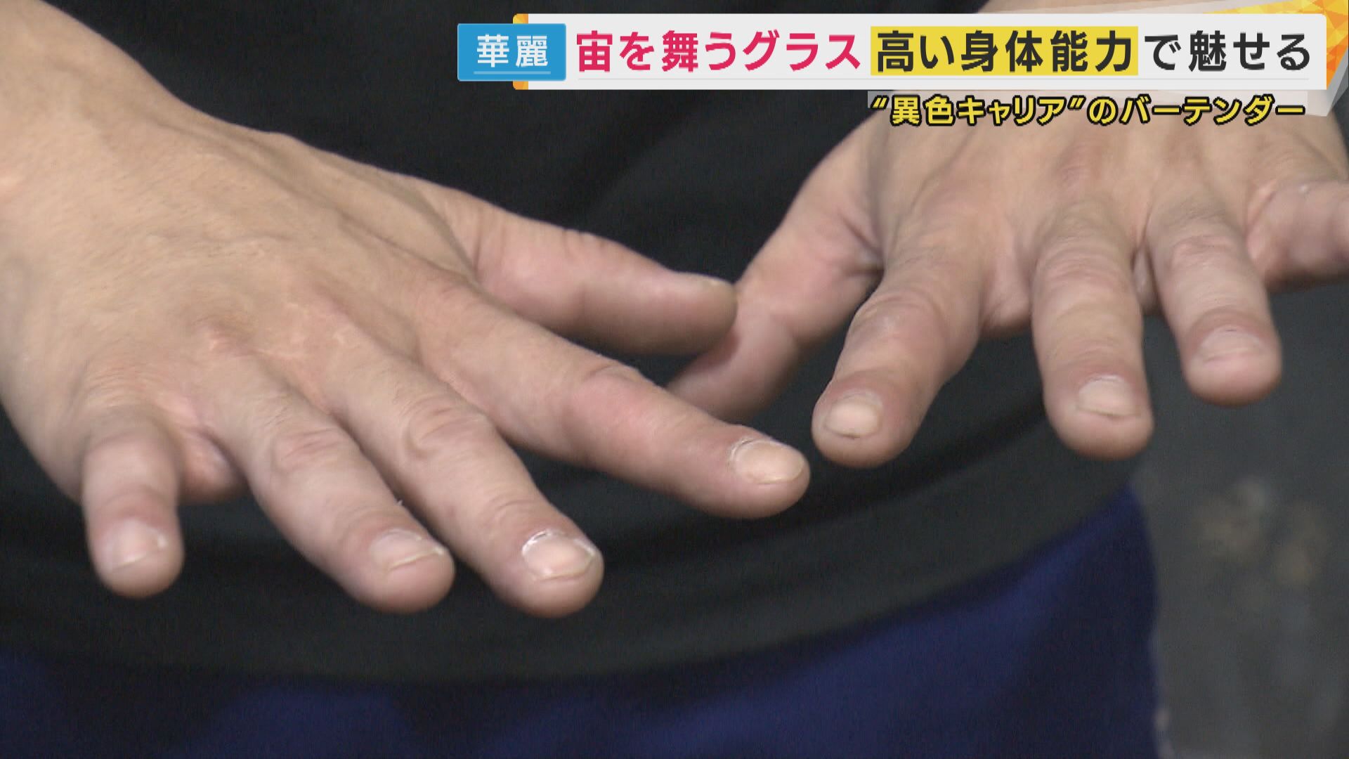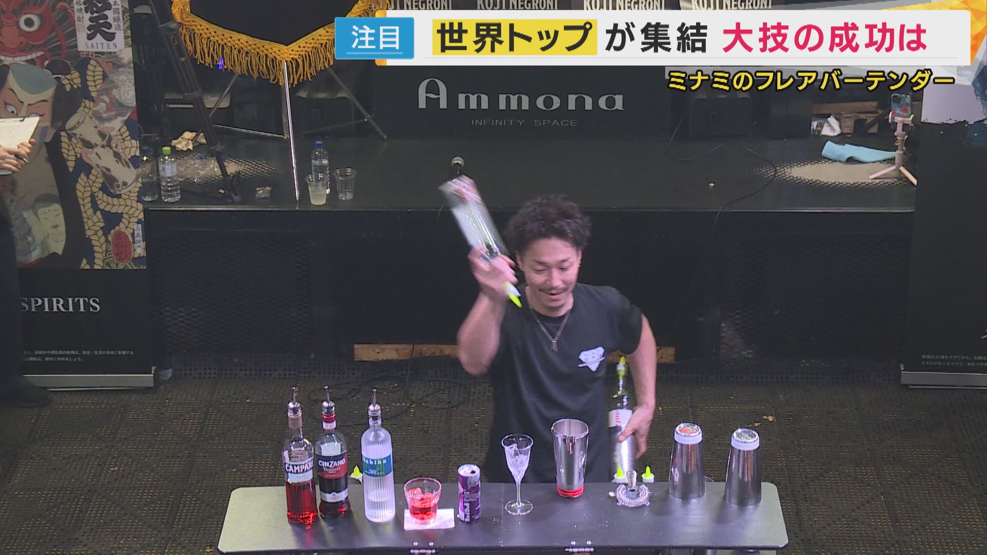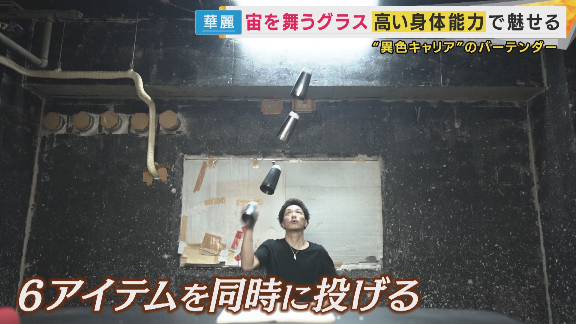 【全日本フレアバーテンダーズ協会 神村美幸副会長】「日本人でもちろんトップの1人です。『それ取れる?』みたいなものが野生的な運動神経で取れてしまうところとか。アイテムの数で言うと一番多いですし、難易度も常に高いレベルでずっと投げ続ける。それが彼の”必殺技”みたいな感じ」