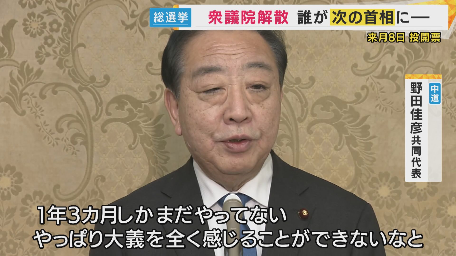 【中道改革連合・野田佳彦共同代表】「1年3か月前なんですよね。総選挙。1年3か月しかまだやってない。やっぱり大義を全く感じることができないなと」