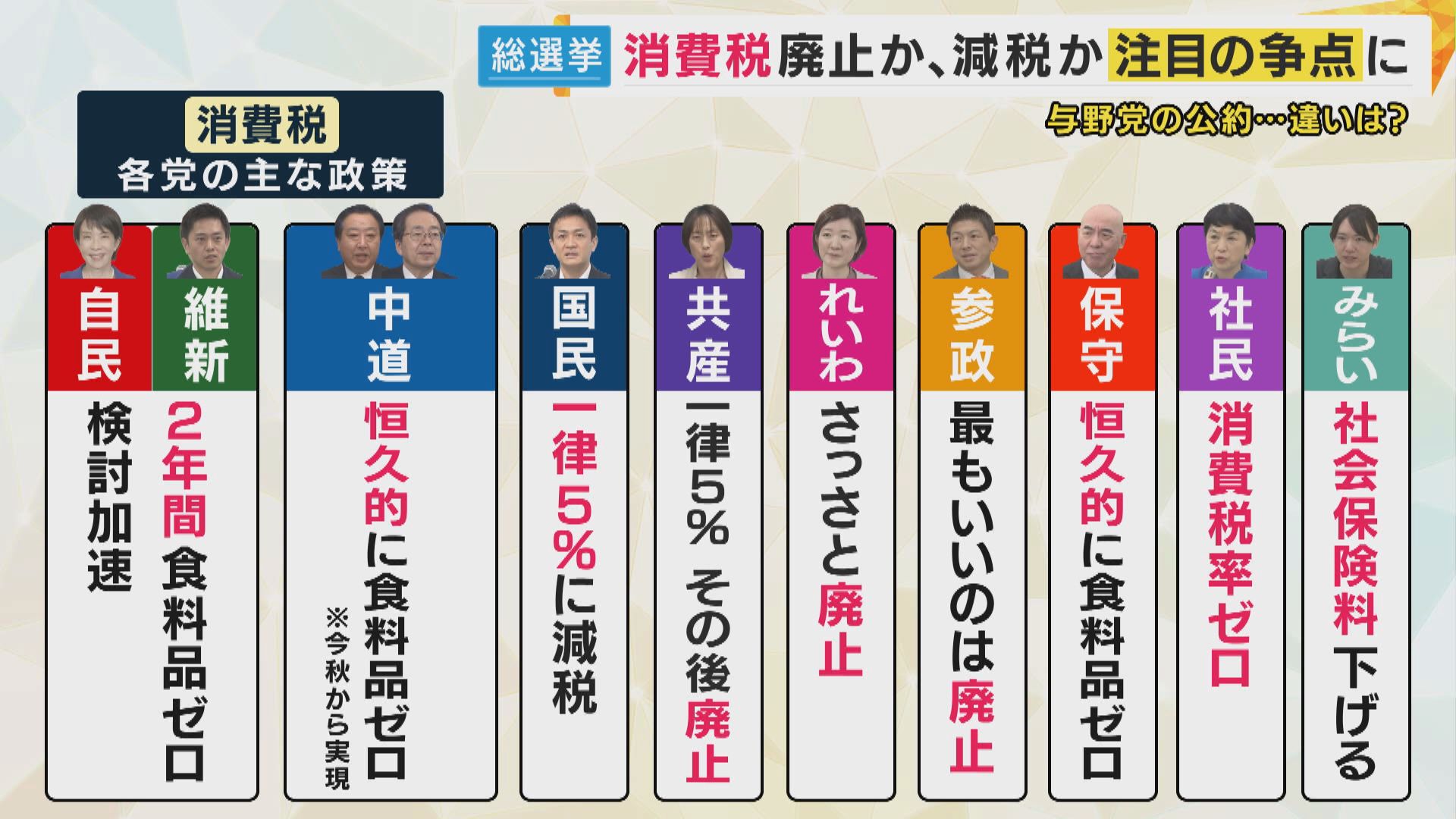 消費税については、税率には幅があるものの、多くの政党が引き下げを目指すとしています。