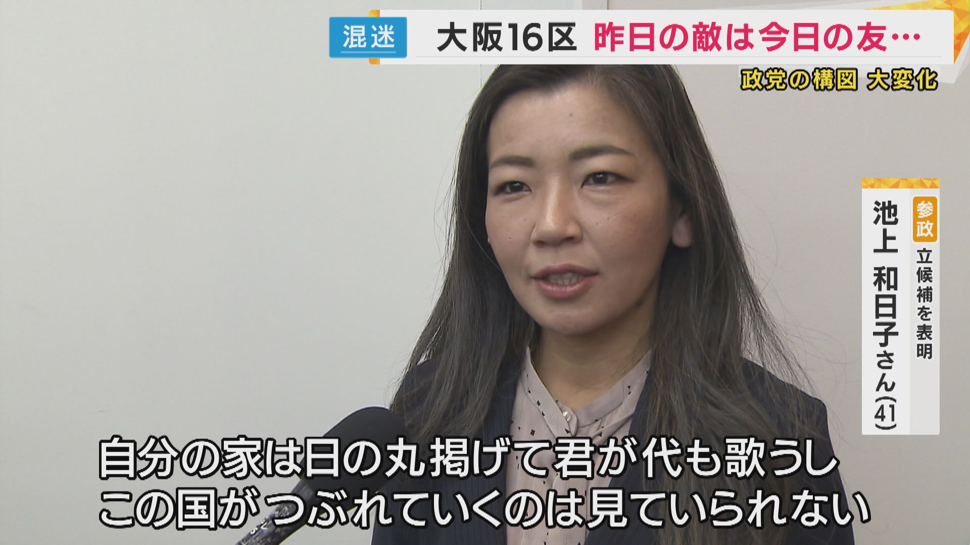 【参政党・池上和日子さん】「自分の家は日の丸掲げて君が代も歌うし、このままこの国がつぶれていくのは見てられない。 自民党も出るとさっき聞いたんで、知らんかったけど。(保守)票が割れるのはもったいない」