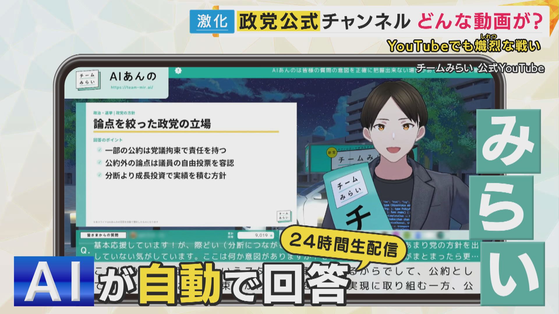 チームみらいもAIを活用。こちらはなんと、安野党首の考えを学習したAIが自動で質問に答えてくれる24時間生配信を実施。