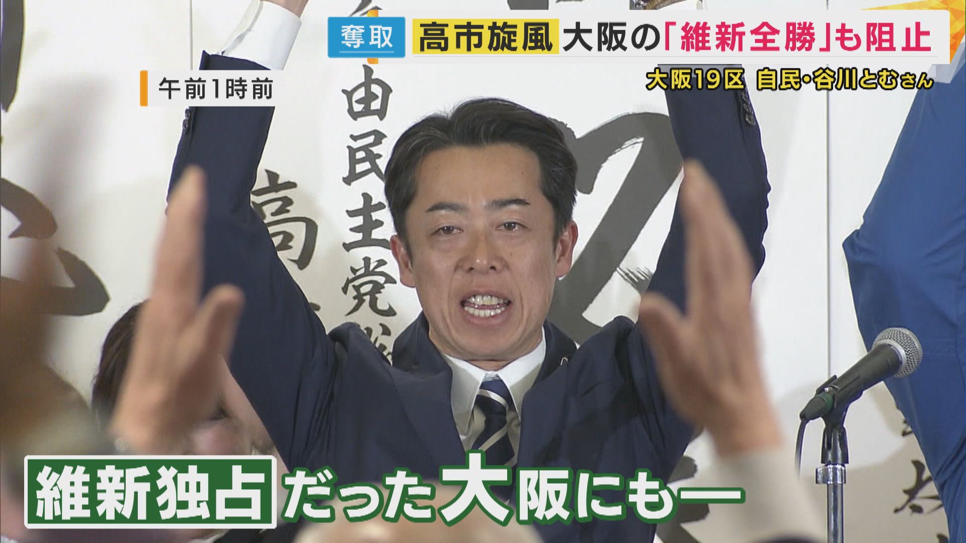 【大阪19区で当選・谷川とむ氏】「はい、すごい競りました。もうでも本当に、みんなのおかげさまです」