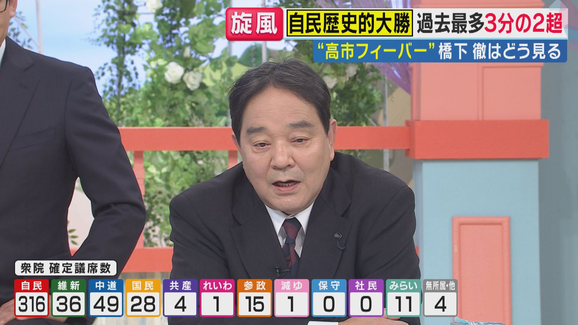 午後8時からの開票特番に出演した橋下徹氏は、「もうこれは当然の結果だと思う」と語り、高市早苗首相の勝負感と政治家スタイルを高く評価しました。