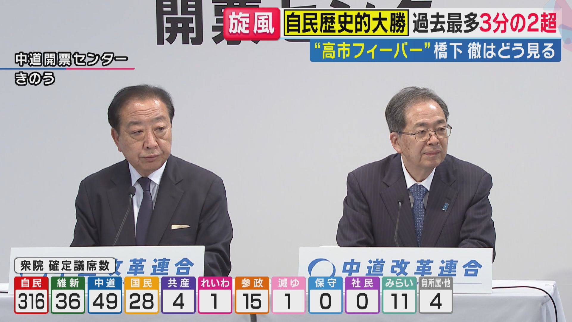 連立与党を組む維新は36議席を獲得しましたが、中道改革連合は49議席にとどまり惨敗しました。