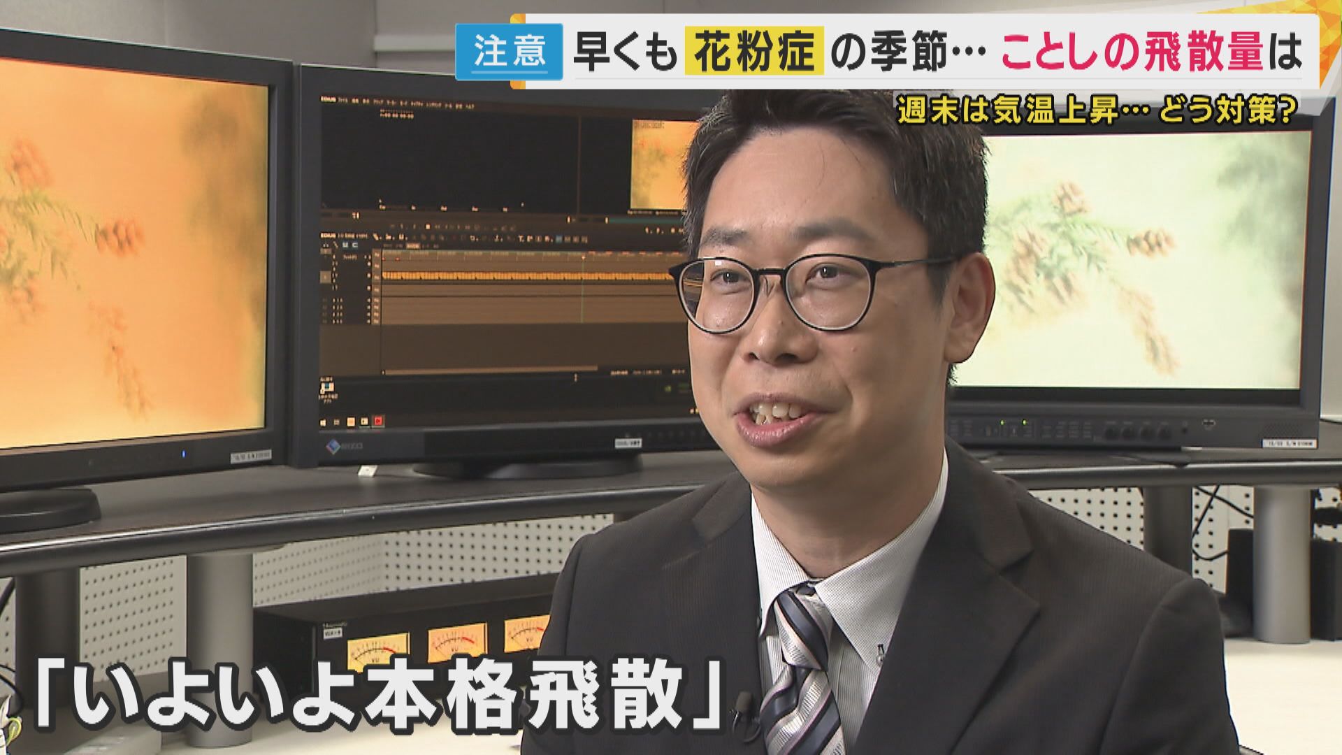 【気象予報士・片平敦さん】「去年はたくさん(花粉が)飛んだいわゆる表年。ことしは裏年で本当は少なくなっても良さそうなのですが、毎年猛暑が続いていて、ことしは去年よりは少ないとはいえ、例年並み。しっかりと花粉症対策が必要なくらいの飛び方になると見ています」