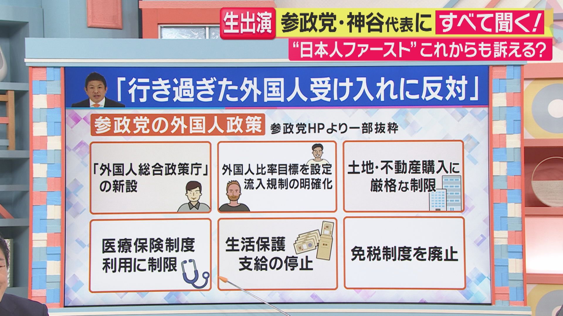 【参政党 神谷代表】「所得の低い方をたくさん入れると、トータル何十年スパンで見ると、経済的にはマイナスです。最終的には国民にして面倒見ないといけないので。
