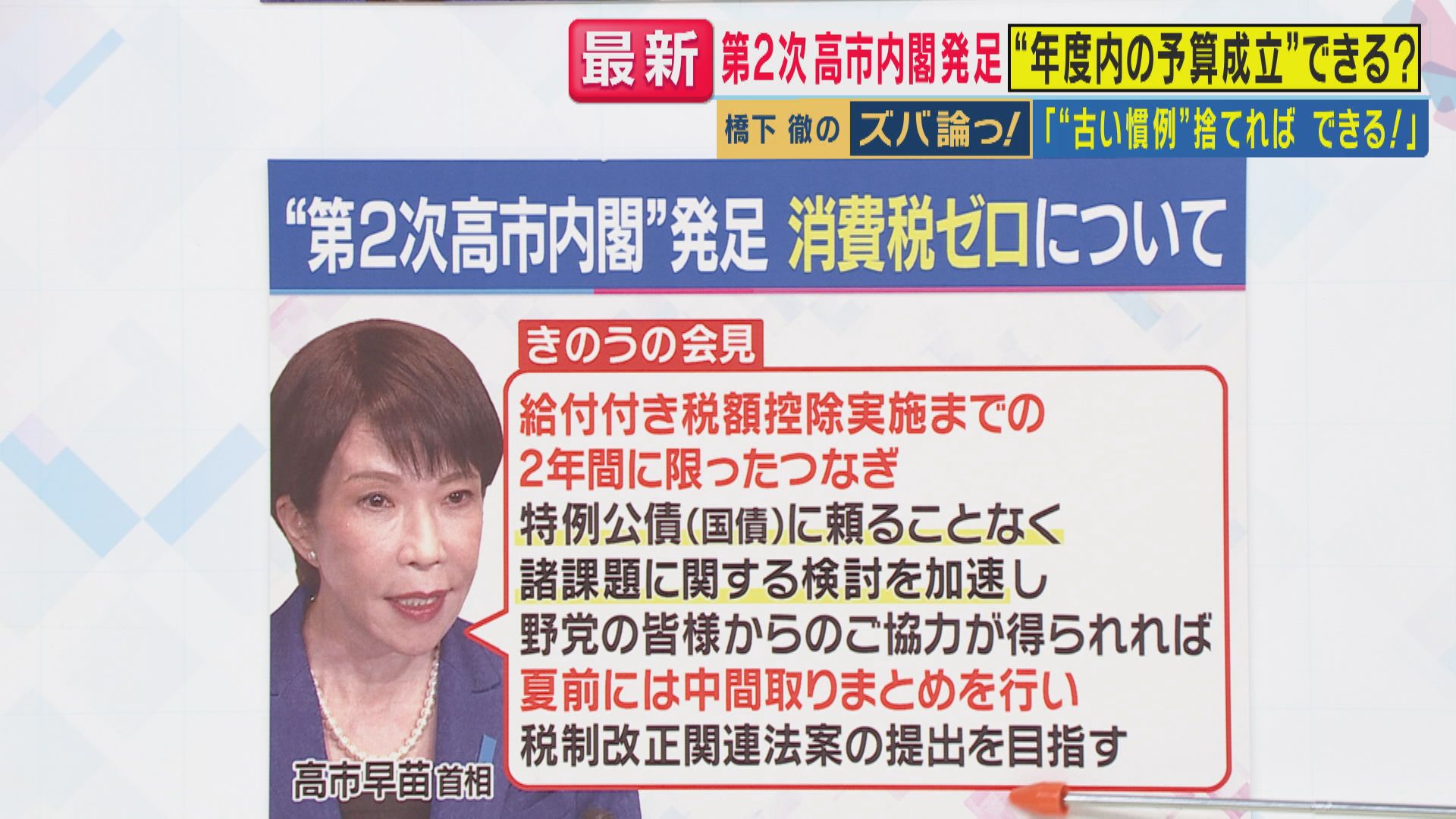 消費税減税について、18日の会見では高市総理は「給付つき税額控除実施までの2年間に限ったつなぎ、特例公債(国債)に頼ることなく、諸課題に関する検討を加速し、野党の皆さまからのご協力が得られれば、夏前には中間取りまとめを行い、税制改正関連法案の提出を目指す」と述べています。