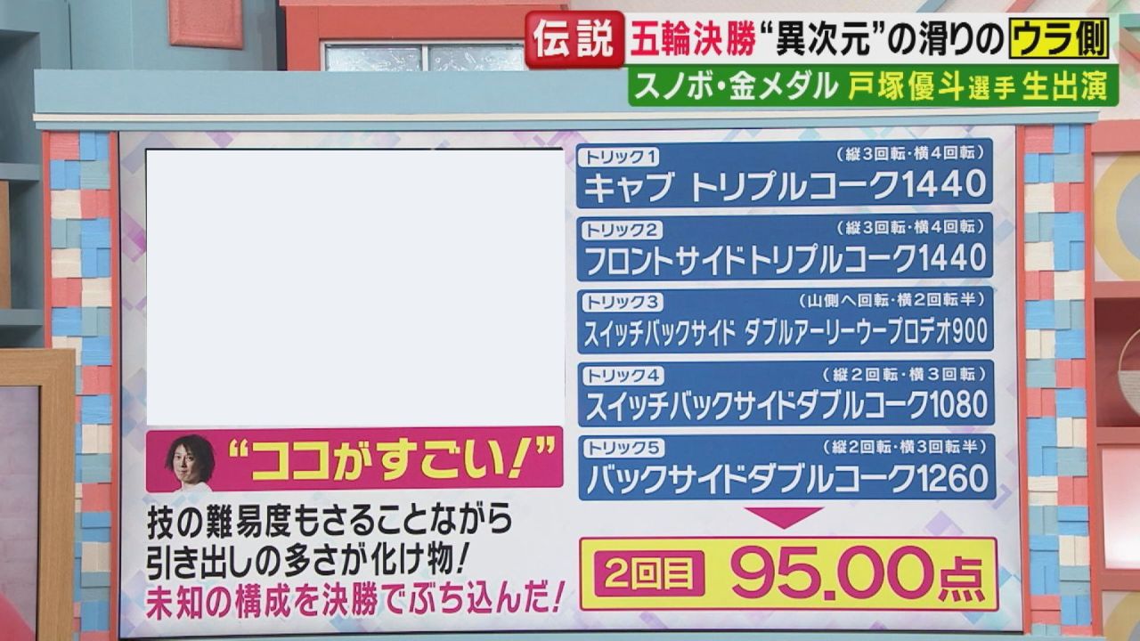 【戸塚優斗選手】「“キャブトリプルコーク”(縦3回転・横4回転)から“フロントサイドトリプルコーク”(縦3回転・横4回転)という、バックトゥバック(連続)の“トリプルコーク”をつなげたのが一番大きい部分。そこが、すごく自分でも褒めてあげたい、本当に意識してた部分」
