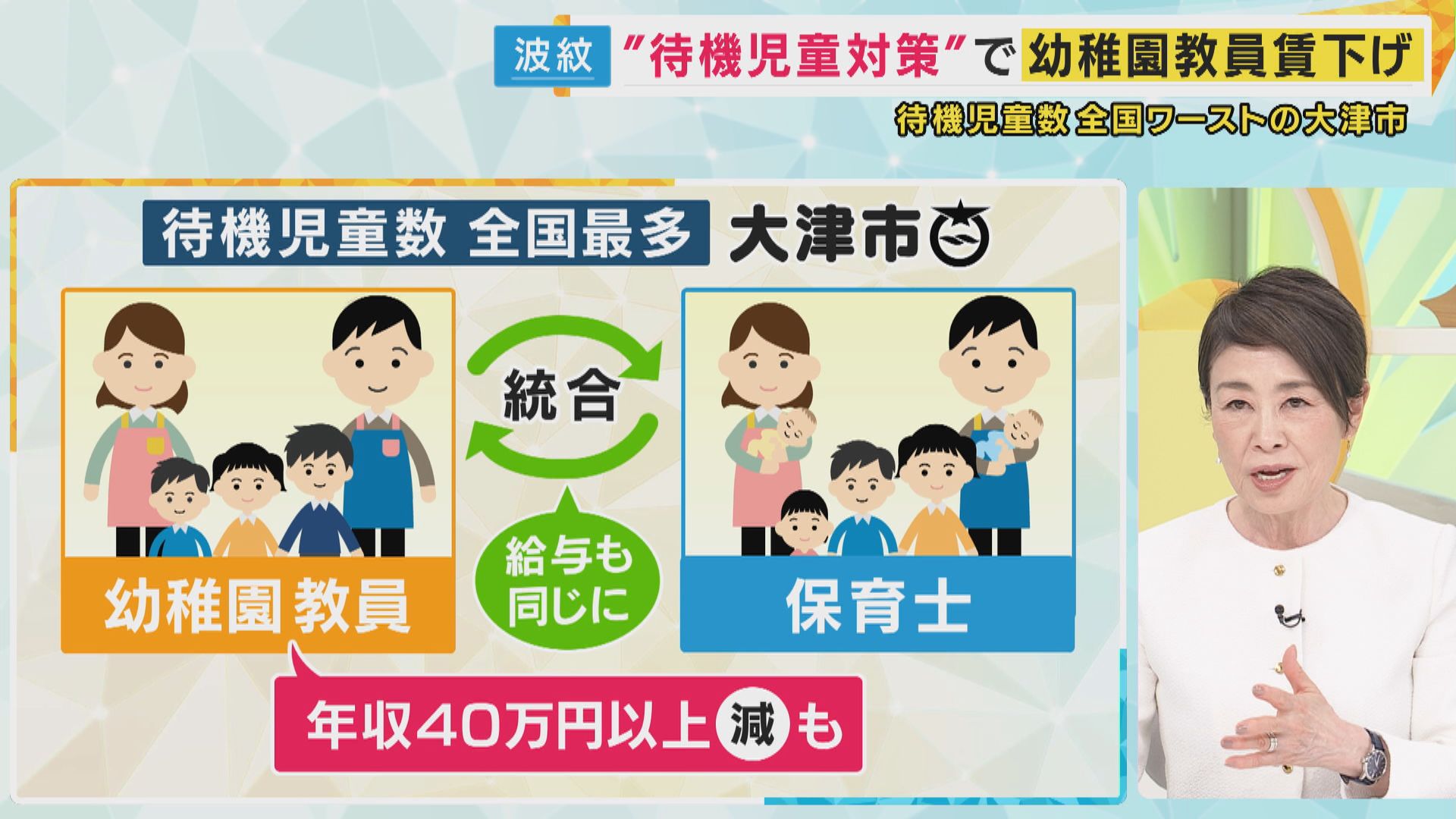 その中で大津市は、これまで別々だった保育士と幼稚園教員の給与体系も統一する方針で、提出された条例案では、給料が「低い方」である保育士にあわせることになっているのです。