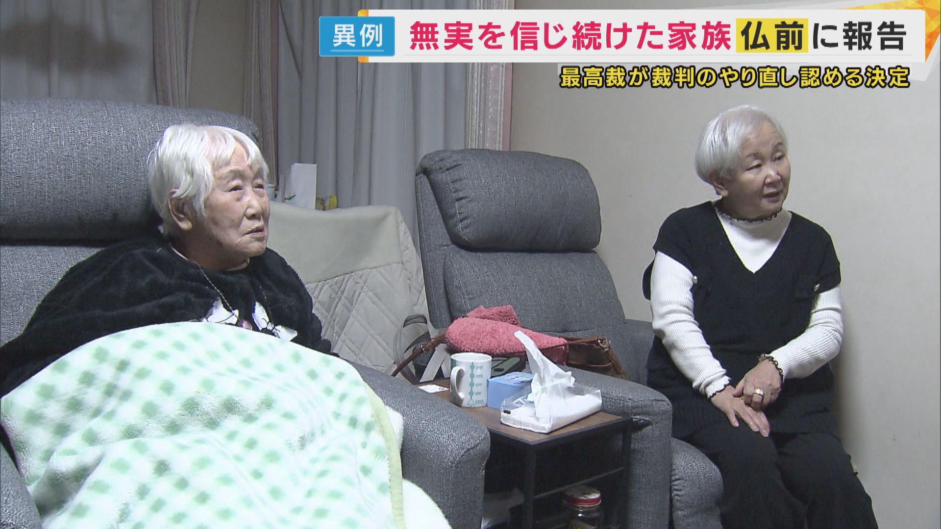 再審開始の決定が知らされたきのう=25日、阪原弘さんの息子・弘次さん(64)は午後11時過ぎに帰宅すると、起きていた母・つやこさん(88)に話しかけました。