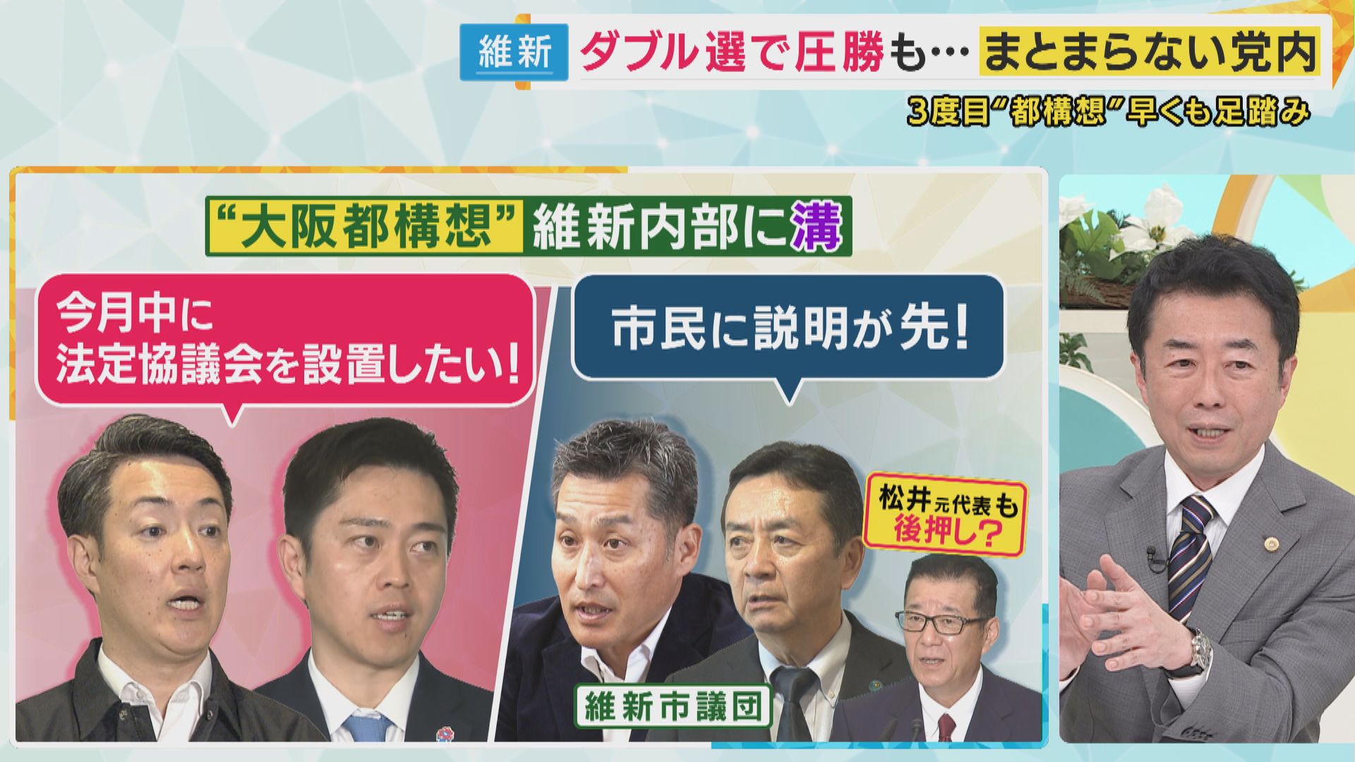 しかし、身内である維新の大阪市議団が「都構想には賛成だが市民への説明が不十分」などと慎重な姿勢を表明。