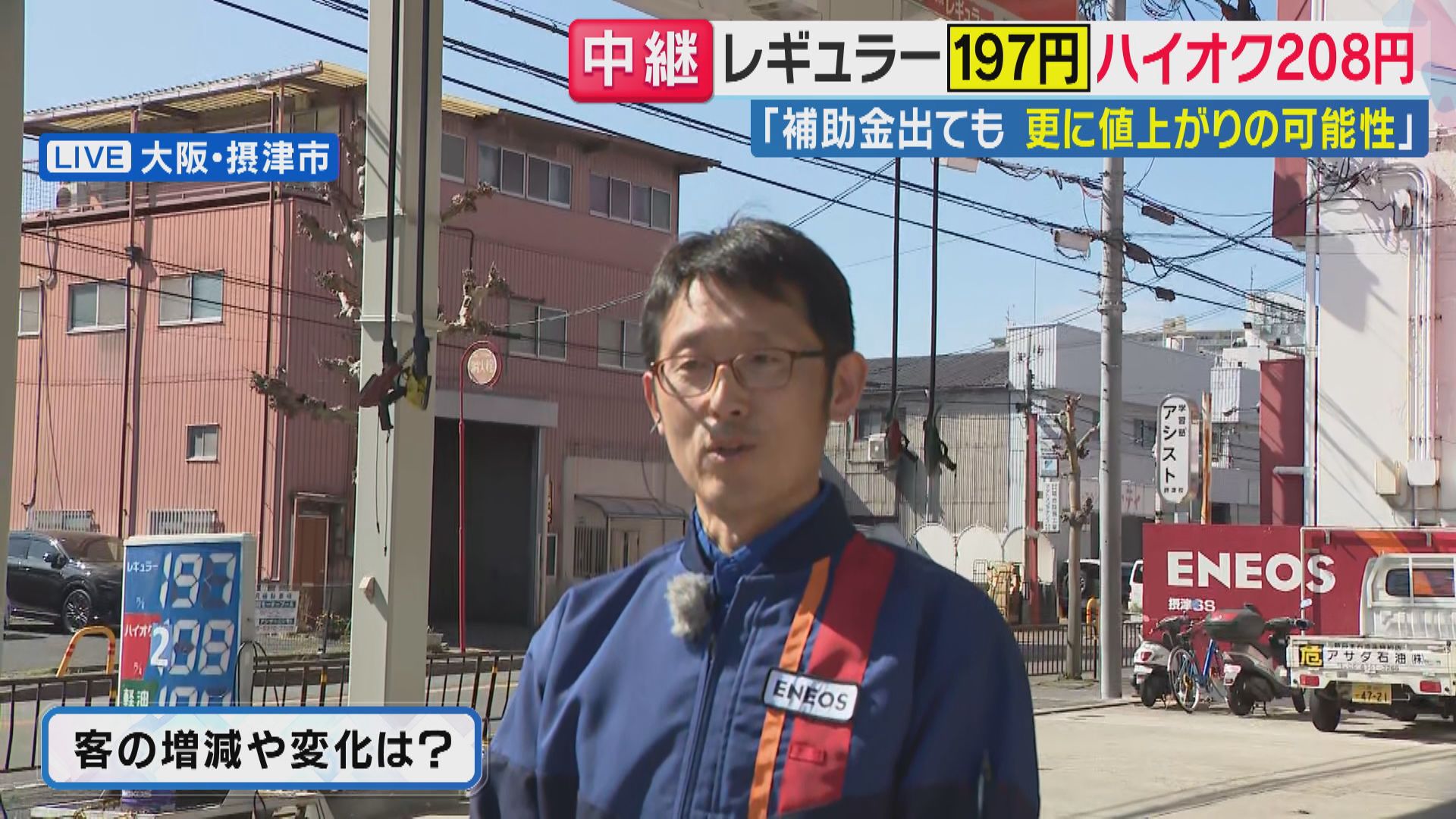 大阪府摂津市のガソリンスタンドでは、レギュラーガソリンが1リットル当たり197円、ハイオクが200円を突破する事態となっています。現場の状況を関西テレビ・秦令欧奈アナウンサーが取材しました。