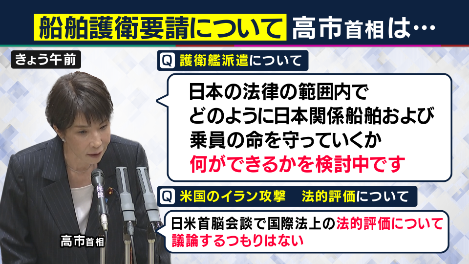 高市総理は16日午前、国会で「護衛艦の派遣については、日本の法律の範囲内でどのように日本関係の船舶及び乗員の命を守っていくか、何ができるのかを検討中です」と答弁。