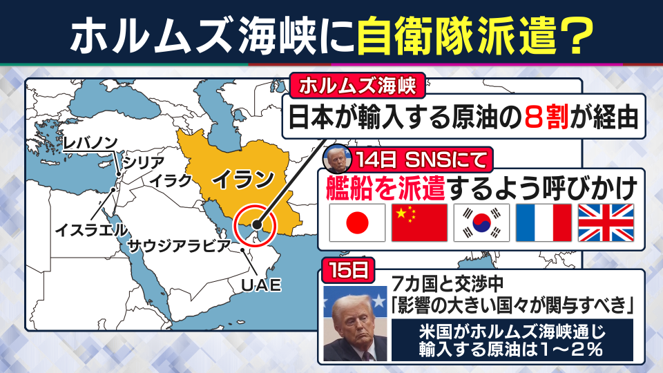 トランプ大統領は、14日、自身のSNSで「ホルムズ海峡を通じて石油を受け取る国々は航行の安全を確保する必要がある」として、日本・中国・韓国・フランス・イギリスに対して、「艦船派遣」を求めました。