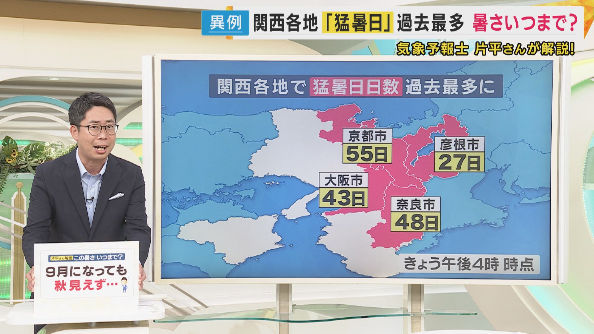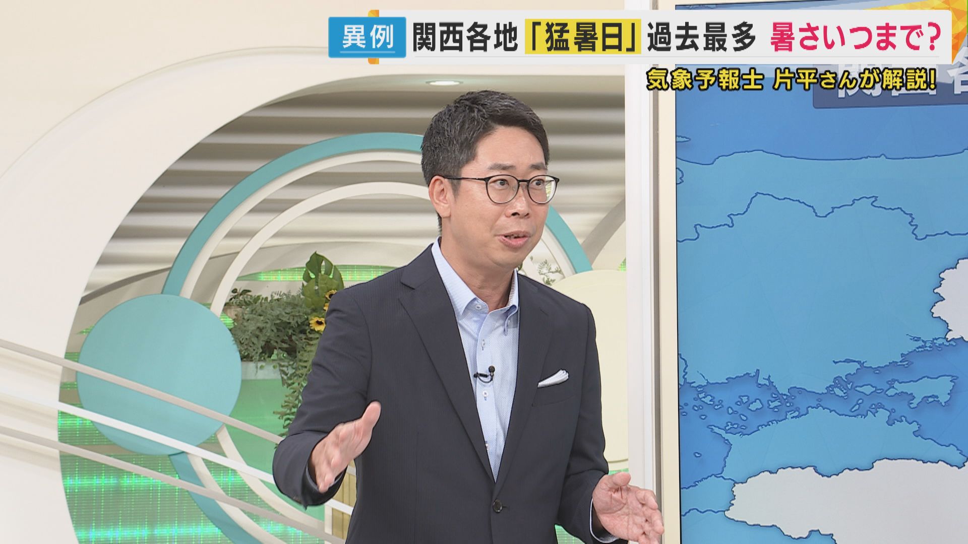 【片平敦気象予報士】「日本全体を見ても、6・7・8月が『夏』という期間なんですけど、ぶっちぎりで過去最高・観測史上一番・統計史上一番『暑い夏』になっていて、それが9月になってもまだまだ続いているわけなんです」