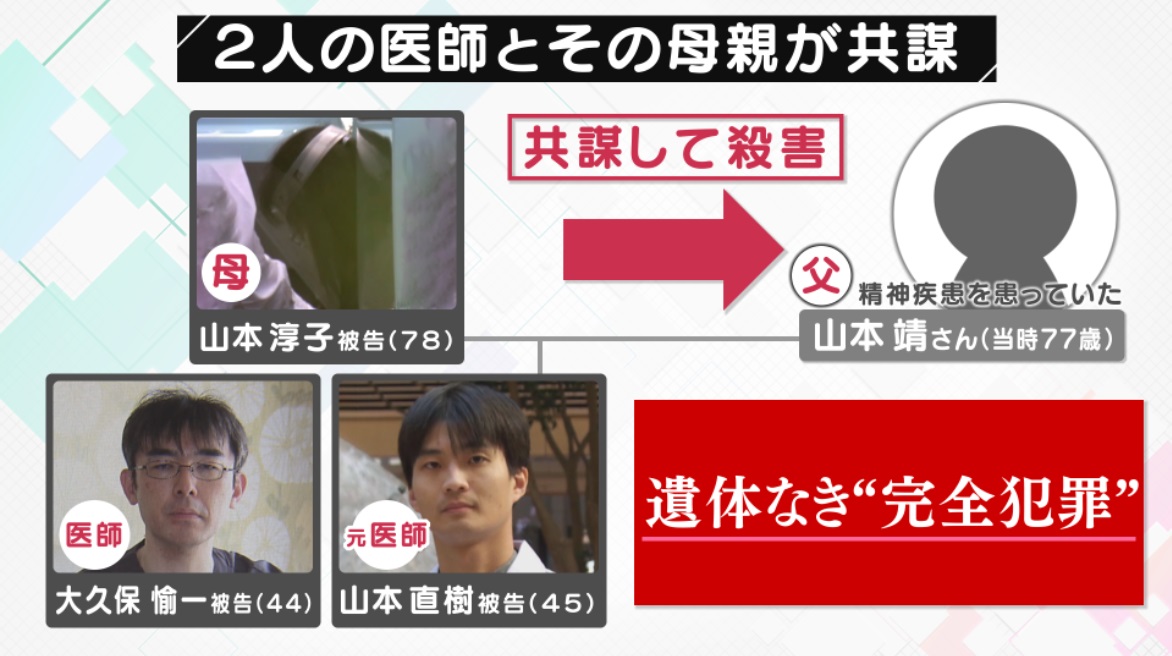 元医師の山本直樹被告(45)は2011年、母親の淳子被告(78)、医師の大久保愉一被告(44)と共謀し、山本被告の父・靖さん(当時77歳)を何らかの方法で殺害した罪に問われていました。
